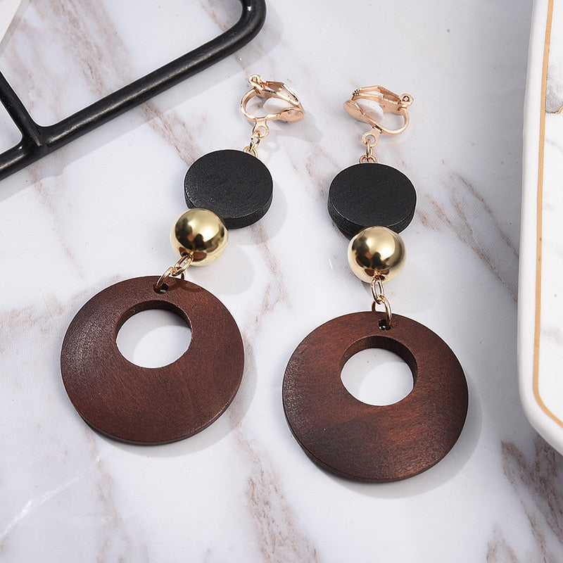 Pendientes de moda: pendientes de madera natural con clip para orejas sin perforación, para mujer, pendientes geométricos de moda, regalo de joyería coreana para chicas.
