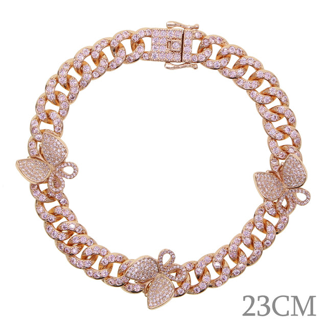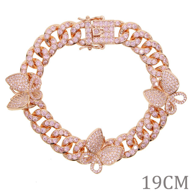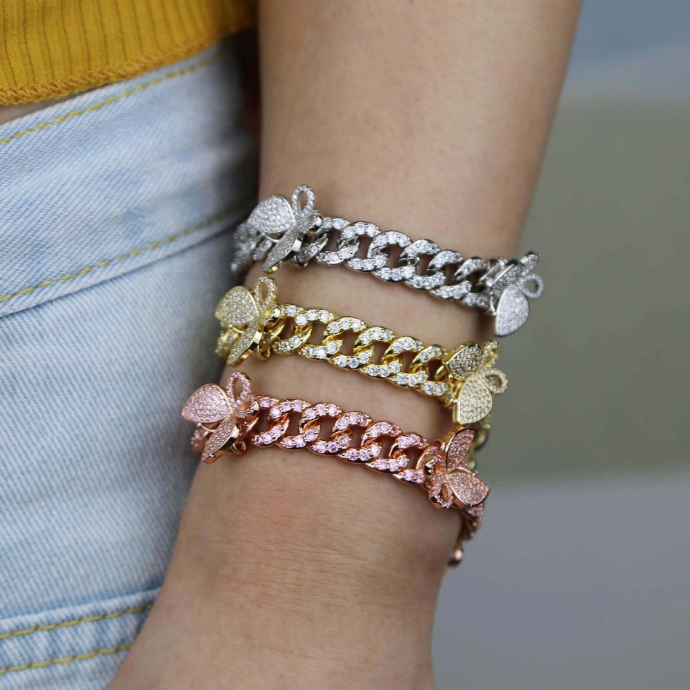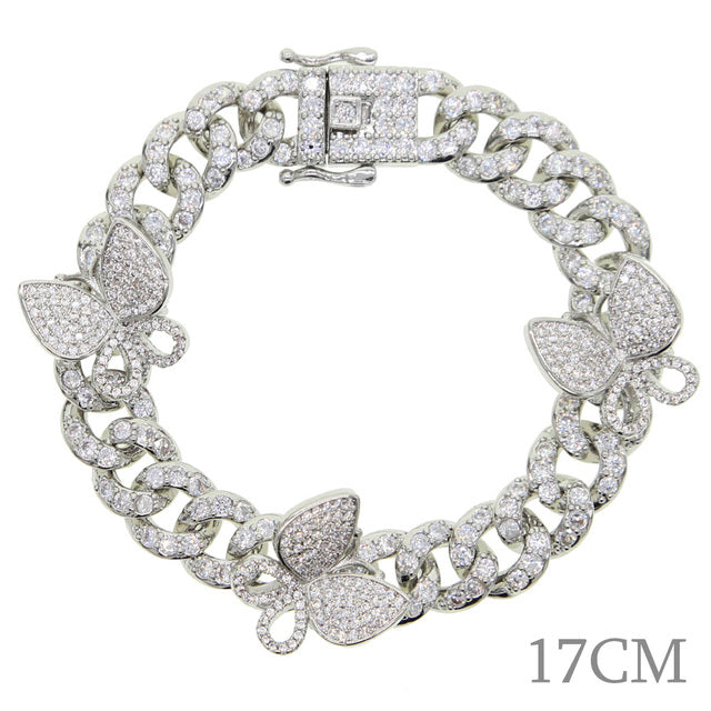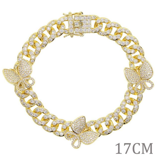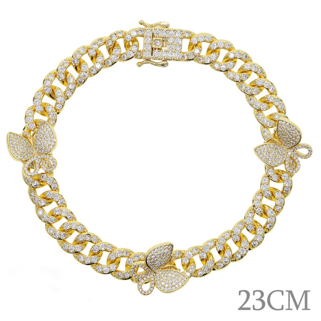 Tobilleras - Nuevas tobilleras con circonitas cúbicas de 10 mm con forma de baguette y mariposa, con eslabones cubanos de Miami, color dorado y plateado, joyería hip hop para mujer