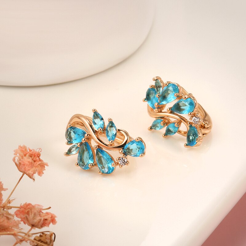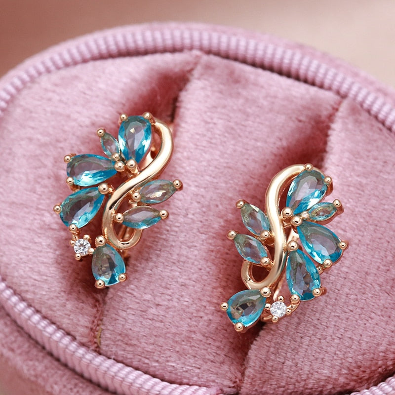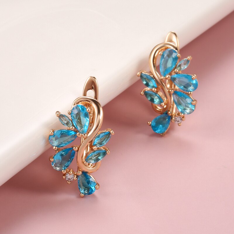 Joyas de oro 585: nuevos pendientes de circonita azul brillante con personalidad, pendientes de hebilla simétrica con curva hueca de oro rosa 585, joyería inusual para fiestas.