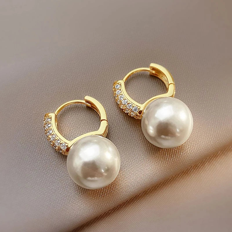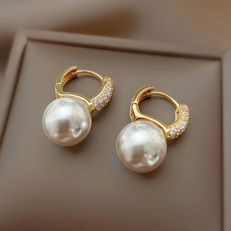 Nuevos y bonitos pendientes de perlas blancas doradas, sencillos y a la moda, con brillantes diamantes, joyería de alta gama para mujer.