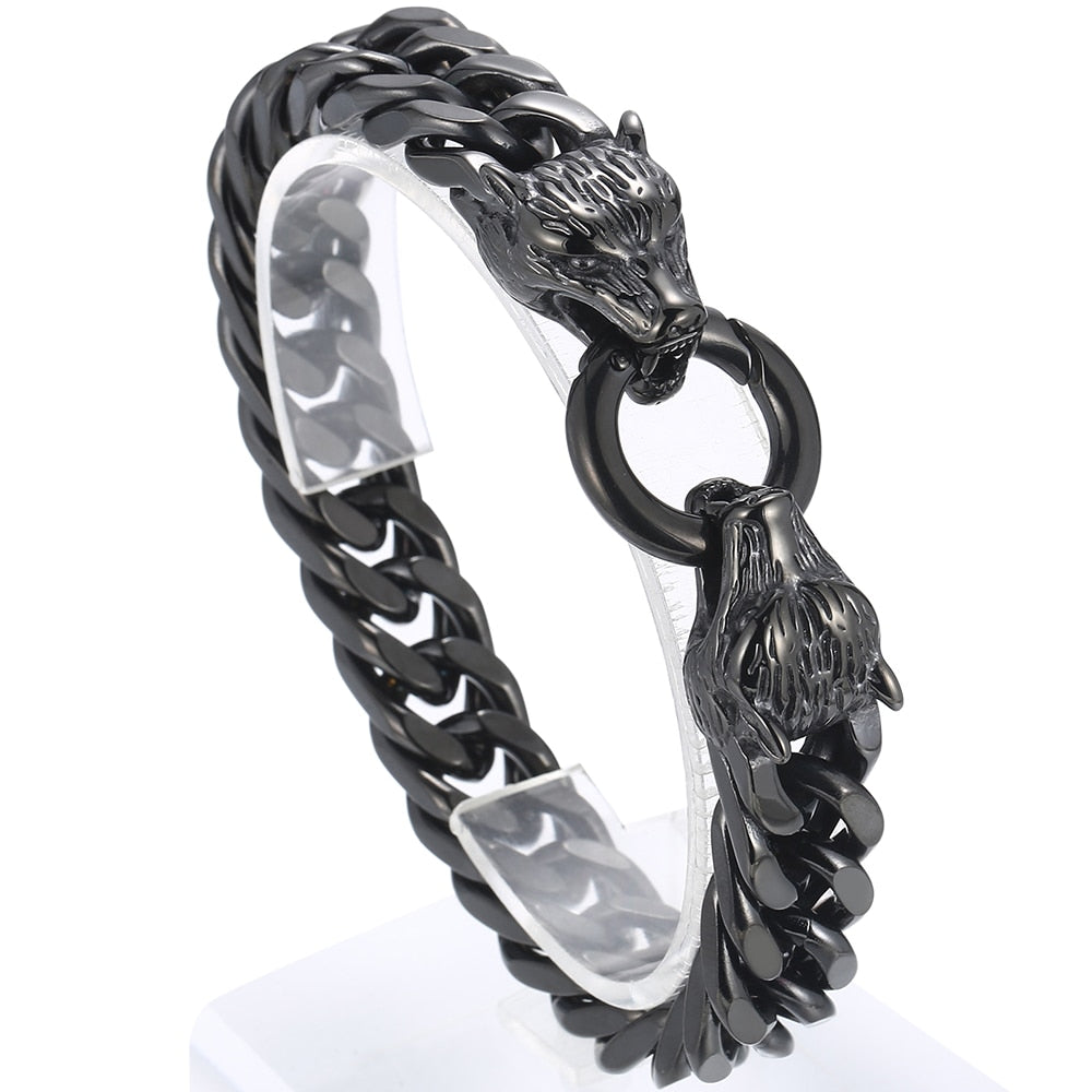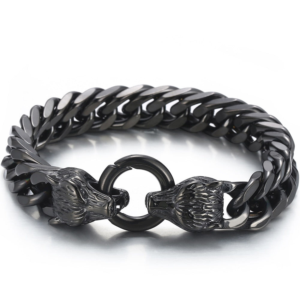 Pulsera de lobo vikingo nórdico para hombre, de acero inoxidable chapado en oro negro, cadena de eslabones de 12 mm.