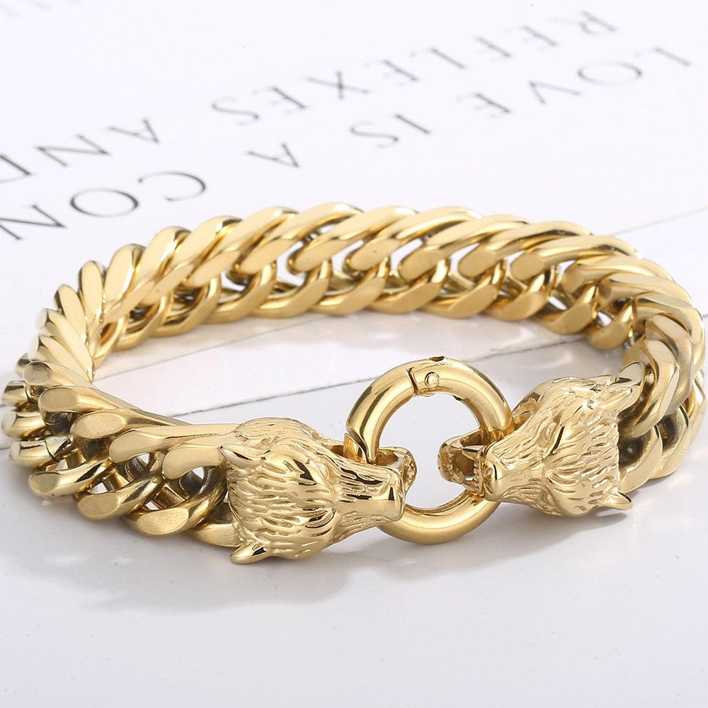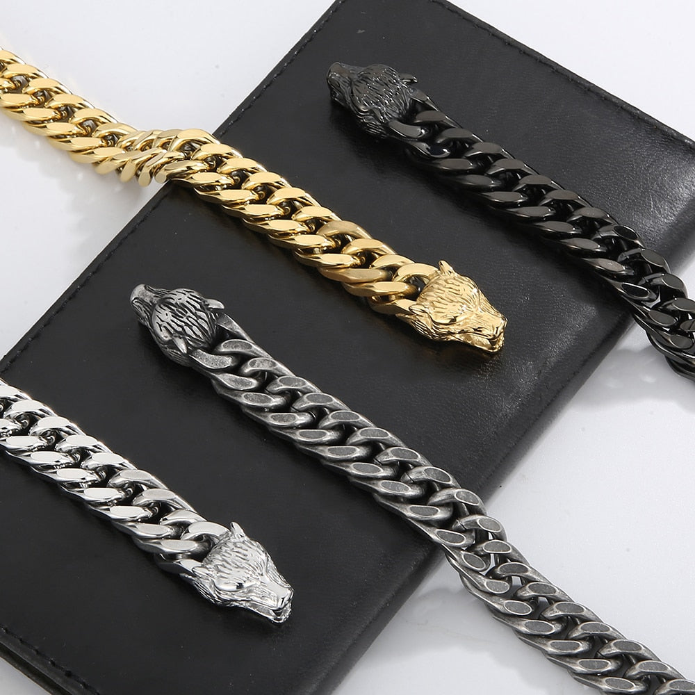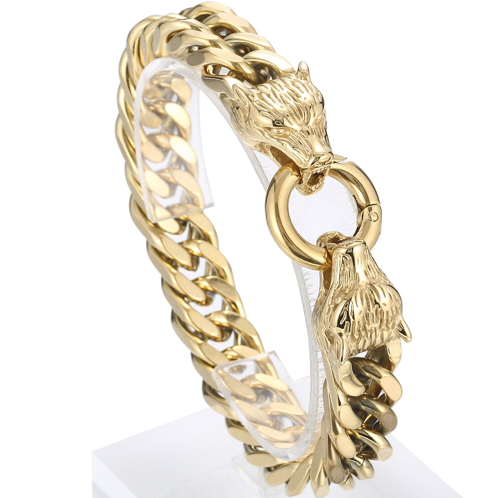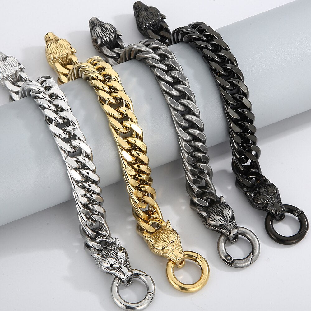Pulsera de lobo vikingo nórdico para hombre, de acero inoxidable chapado en oro negro, cadena de eslabones de 12 mm, joyería nórdica punk.