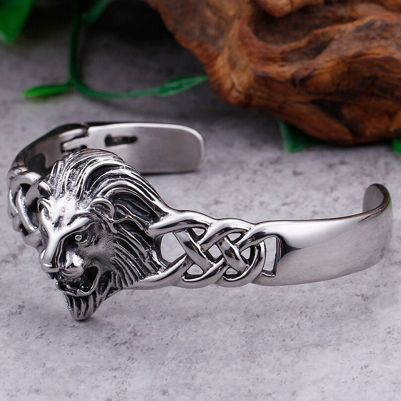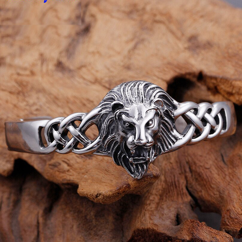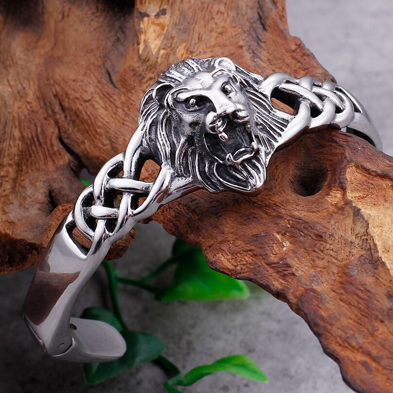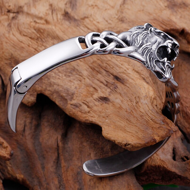 Brazalete abierto de acero inoxidable pulido con cabeza de león para hombre, estilo punk rockero, estilo gótico, accesorios de joyería para motociclistas.