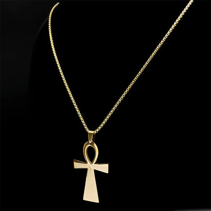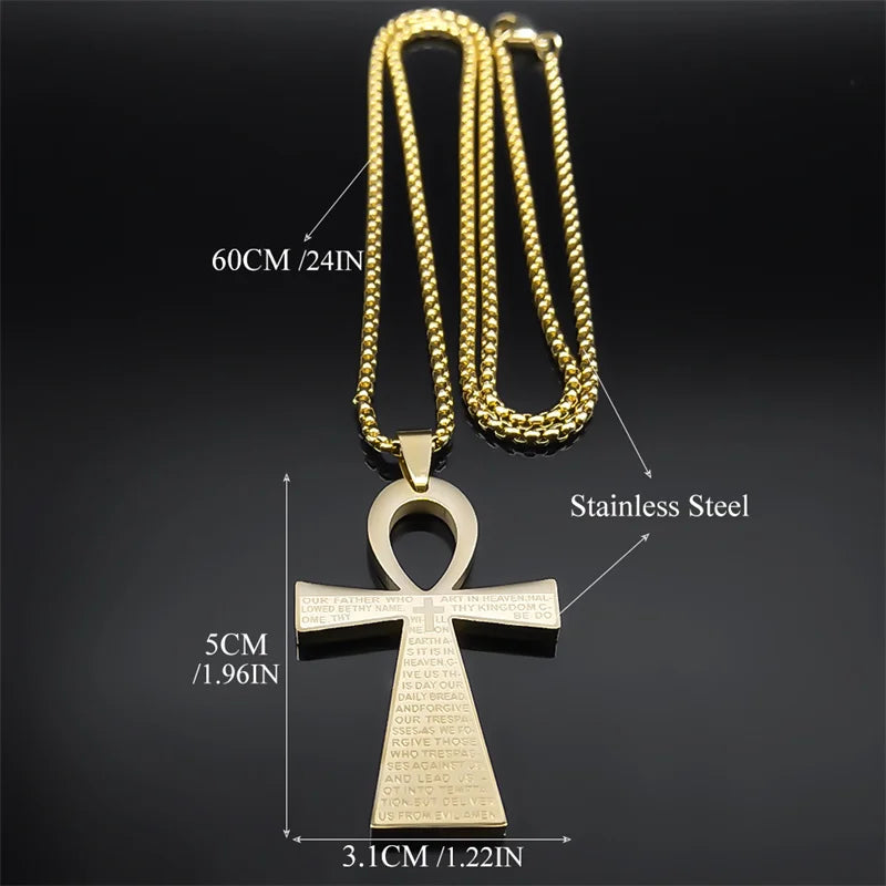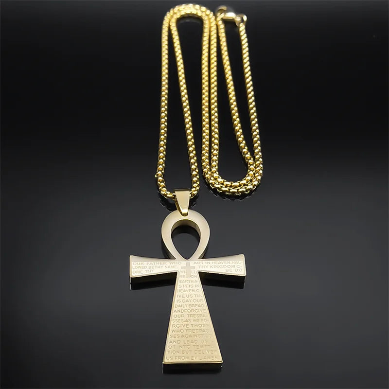 Collar con colgante de cruz Ankh con oración del Padre Nuestro, llave de la vida, para hombres y mujeres, cadena de acero inoxidable color dorado, joyería