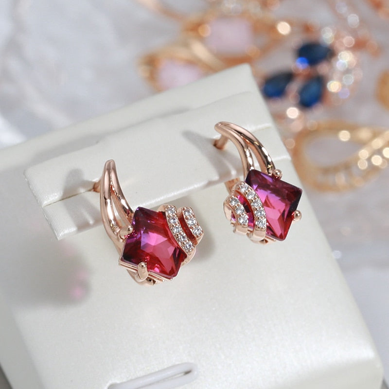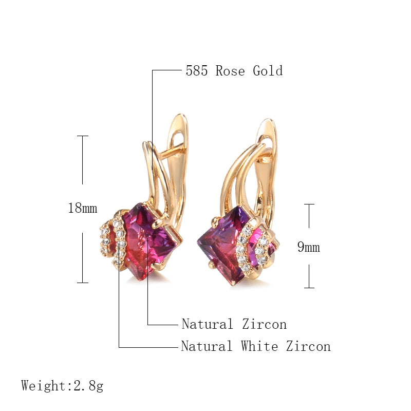 Pendientes de oro 585 con circonitas cuadradas fucsias, lisos y modernos, color oro rosa 585, joyería de lujo para bodas, pendientes sexys de fiesta para mujer.