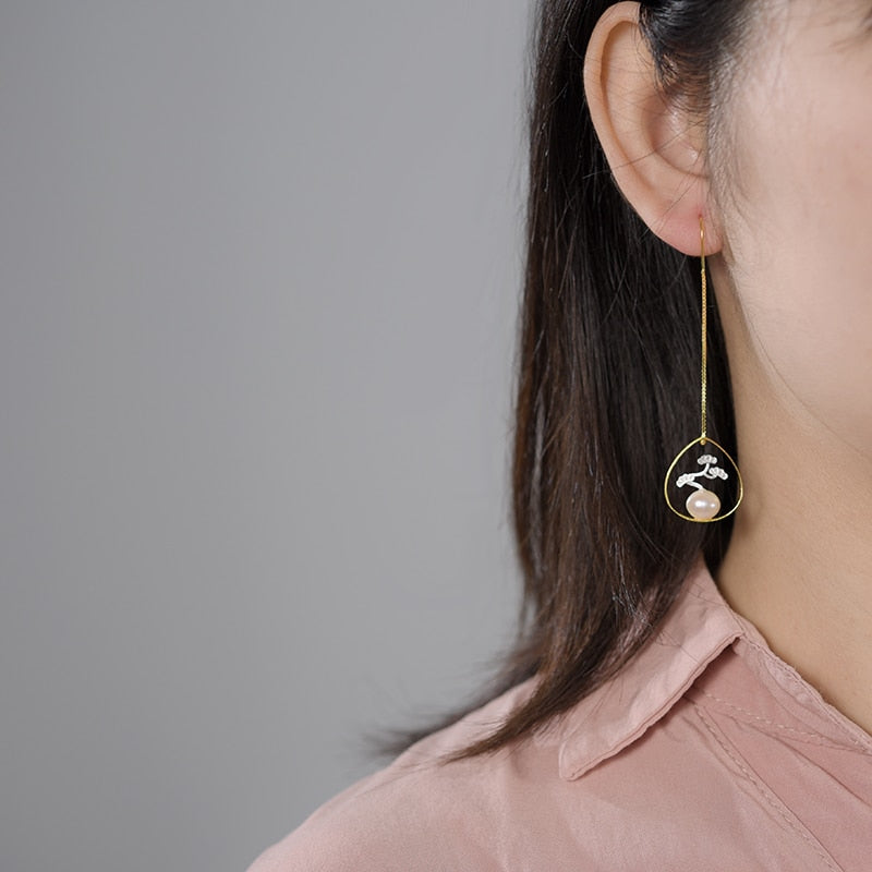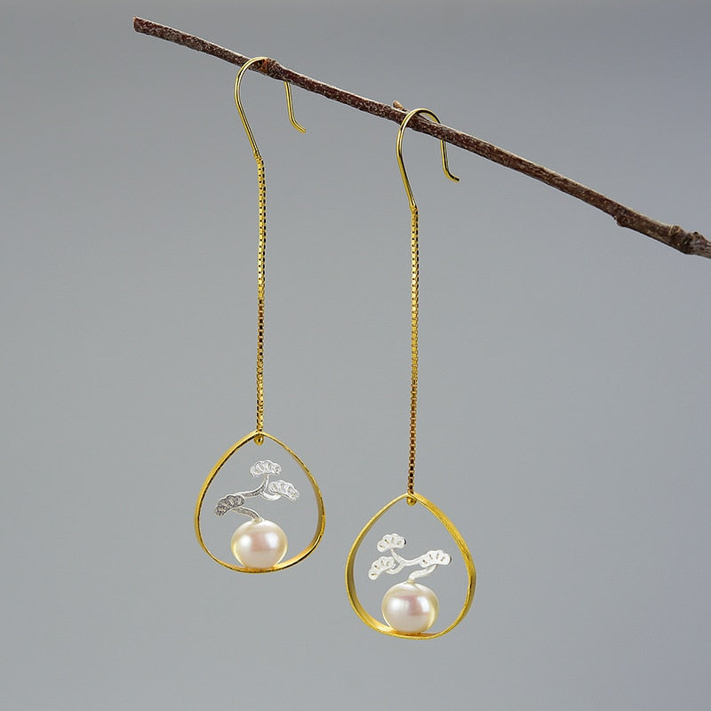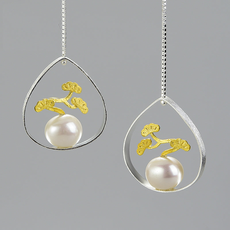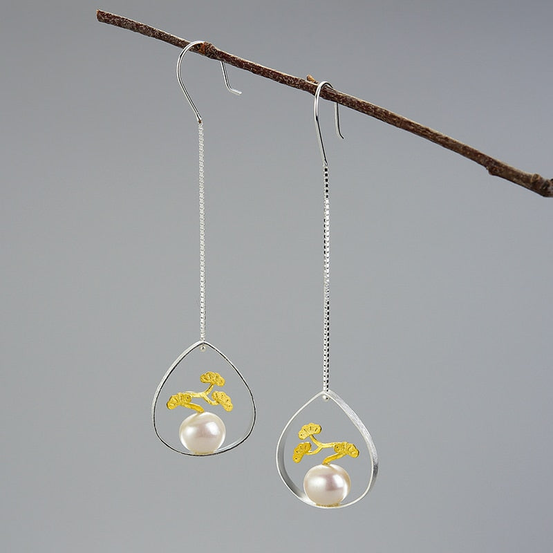 Pendientes colgantes de planta de pino con perlas naturales de plata de ley 925 auténtica