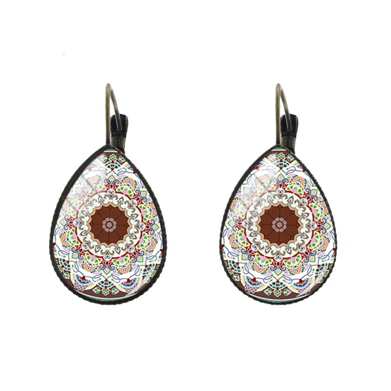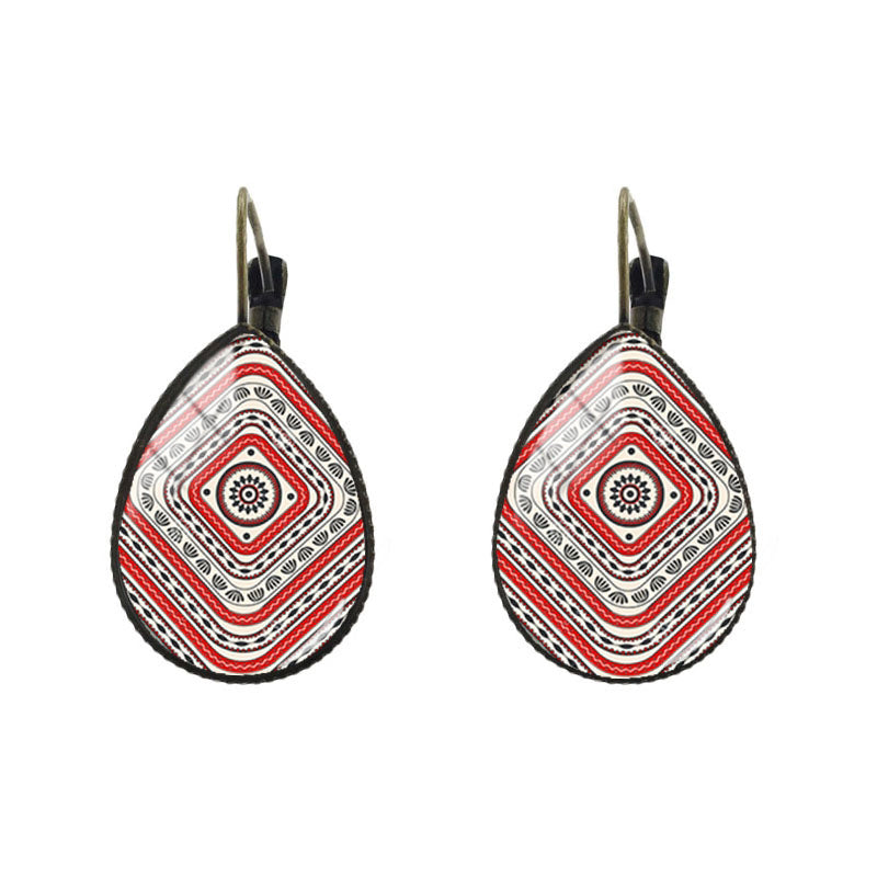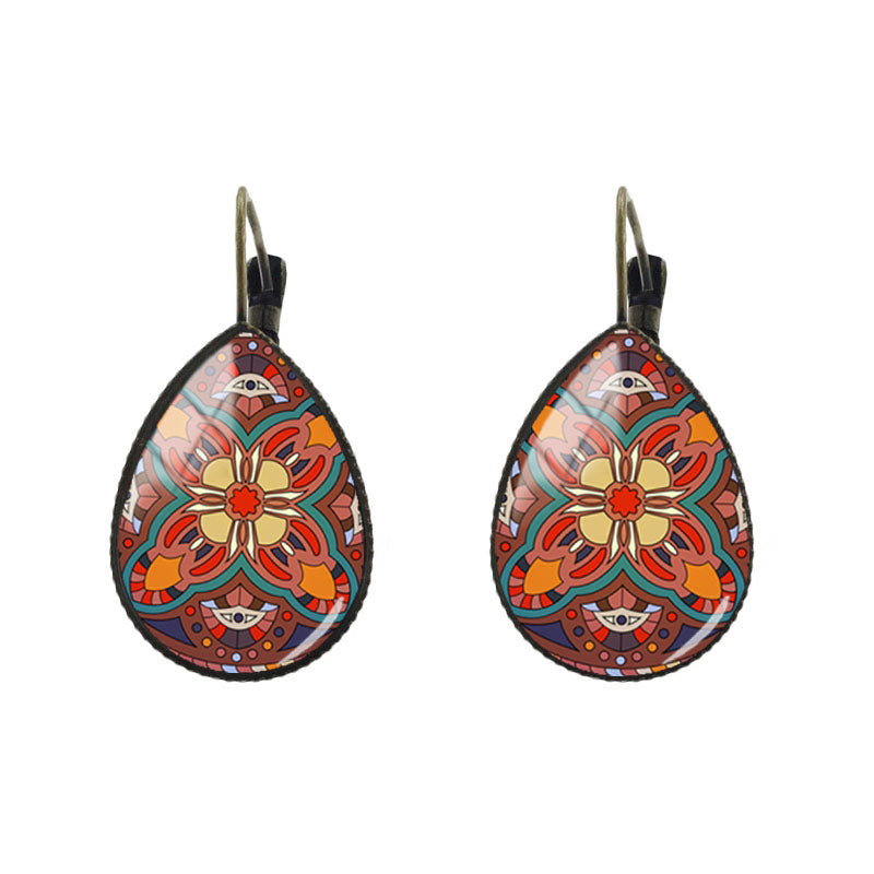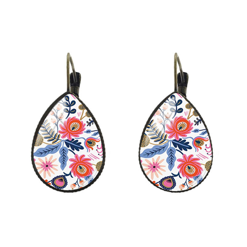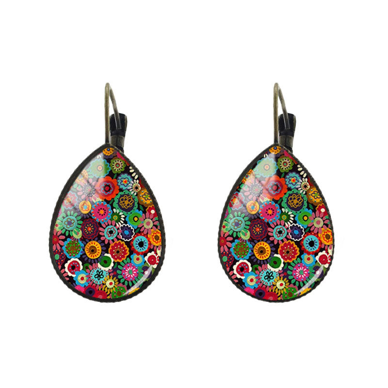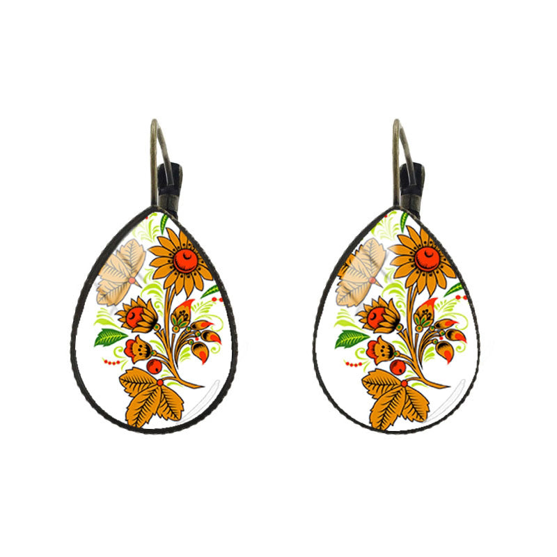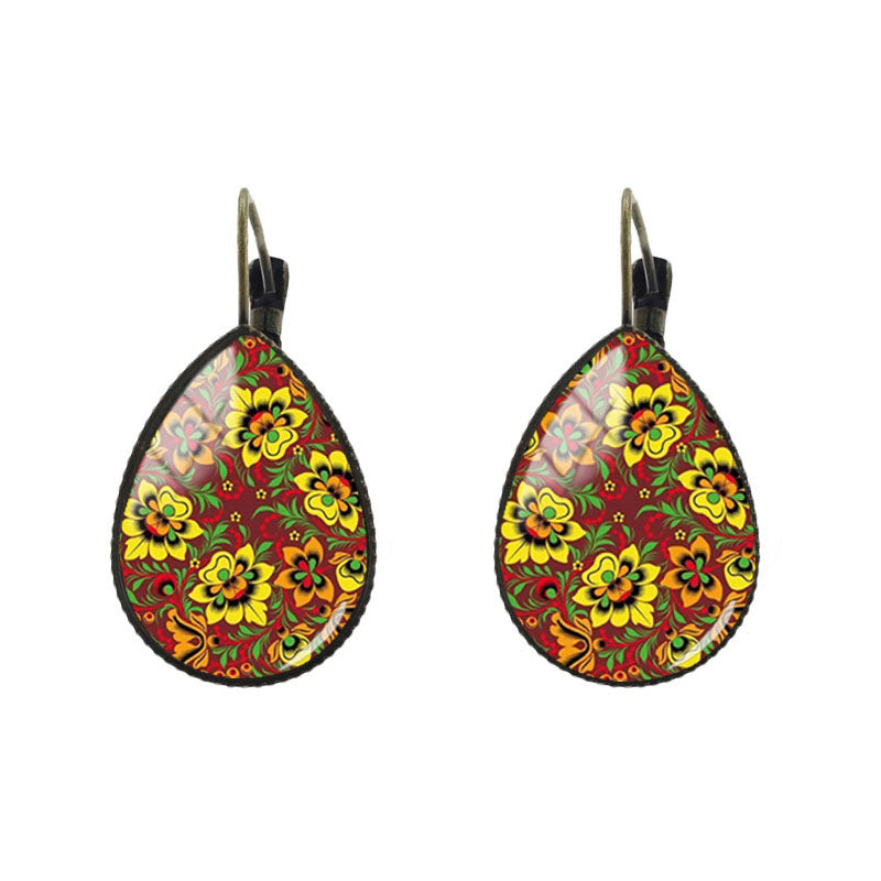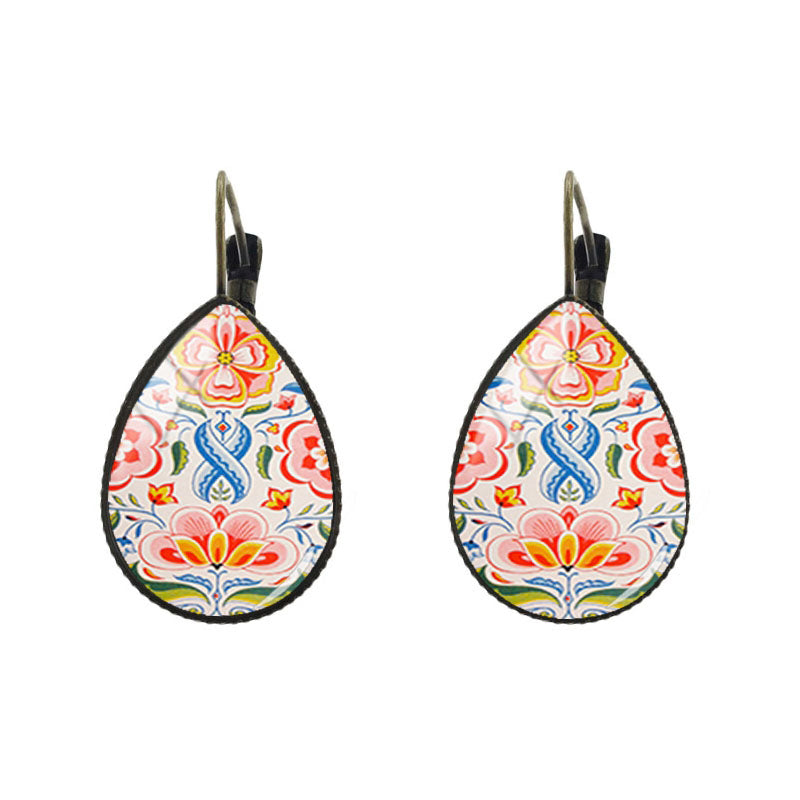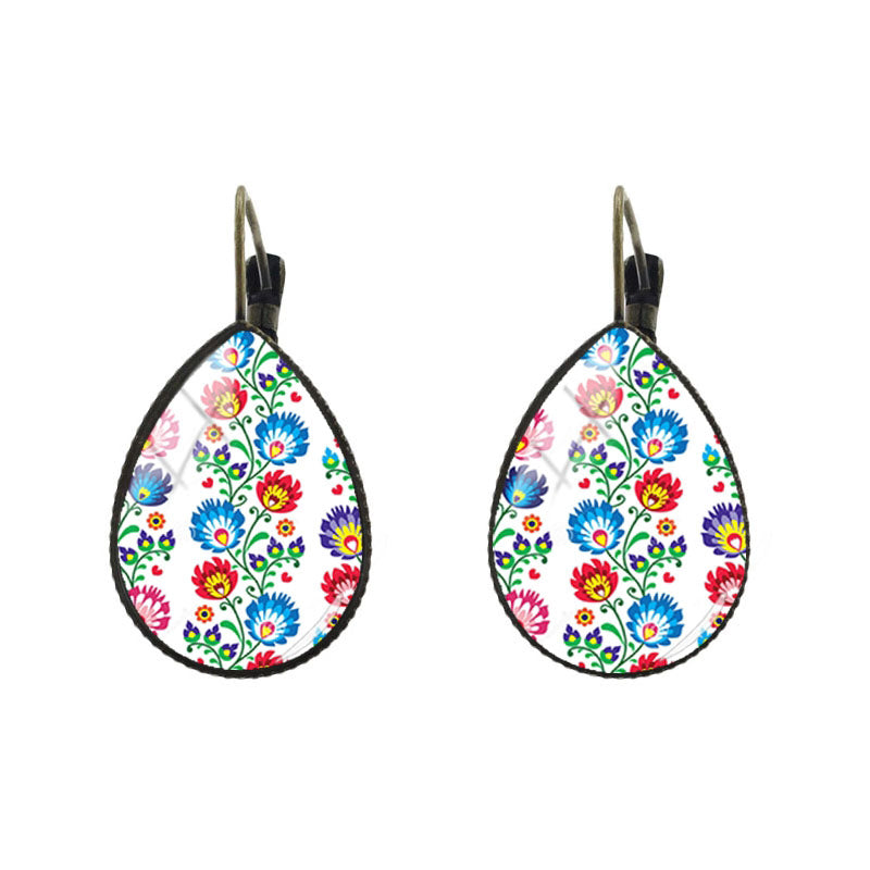 Pendientes de clip con forma de gota de agua y foto de flor de cristal con patrones de arte popular polaco