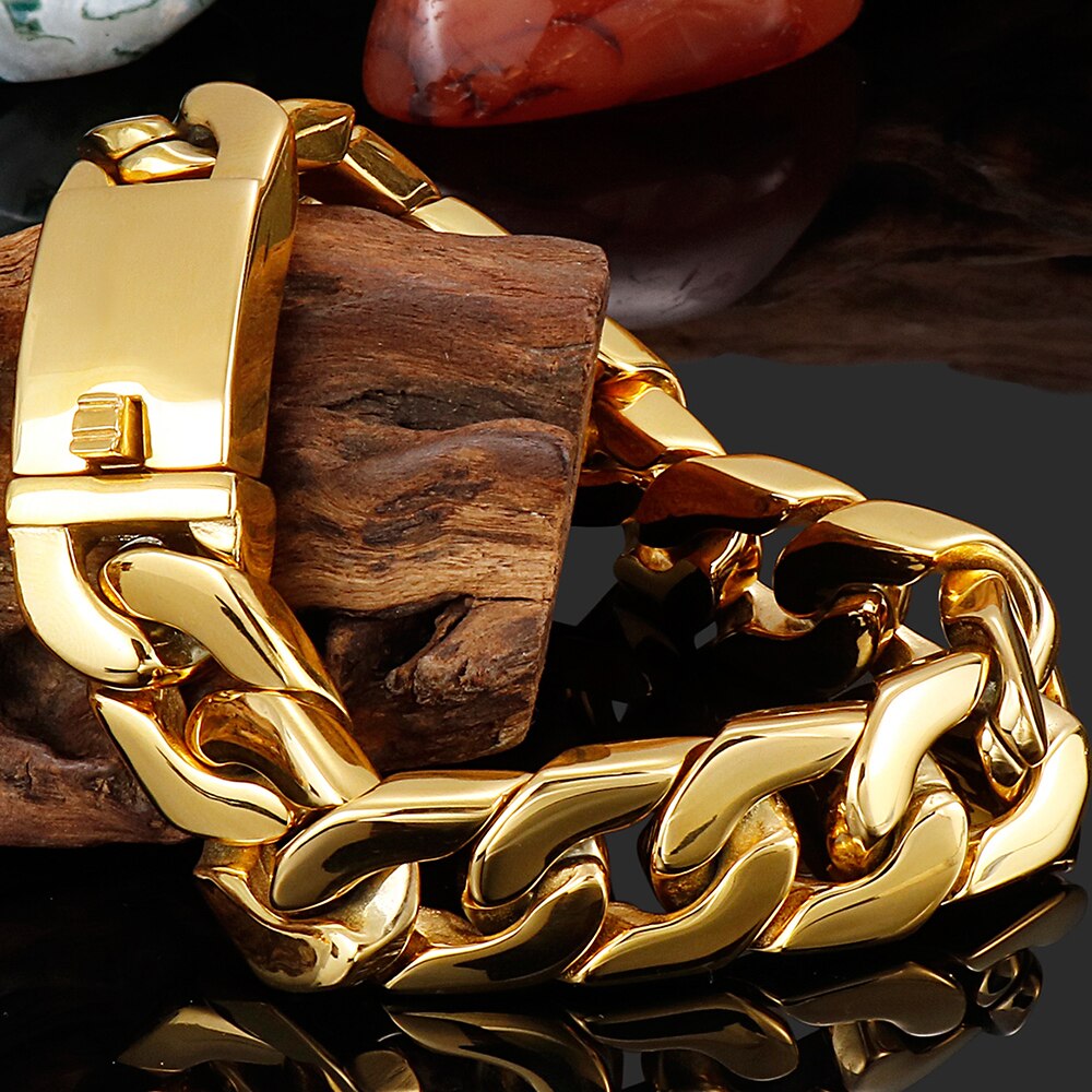 Pulsera de acero inoxidable chapada en oro pulido para hombre. Brazaletes de mano para niño. Accesorios de joyería para hombre.