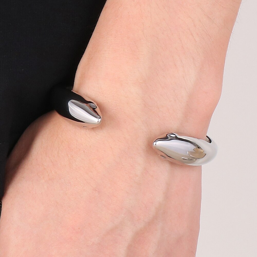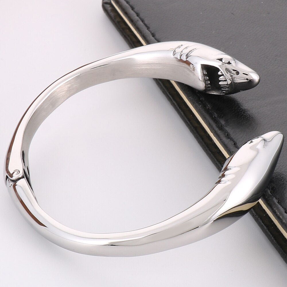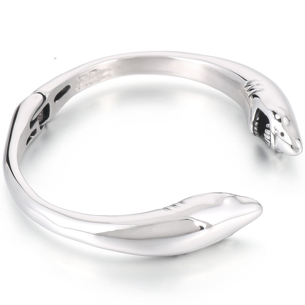 Brazalete abierto con dije de delfín doble de acero inoxidable pulido para hombre
