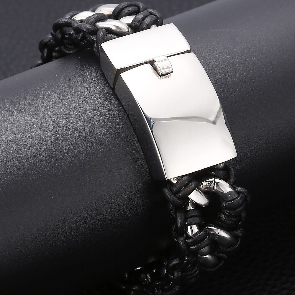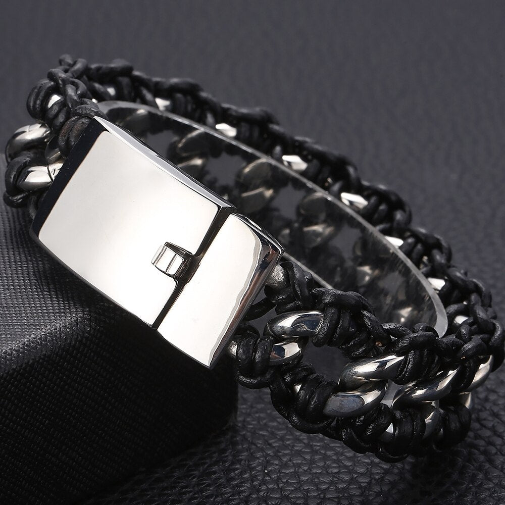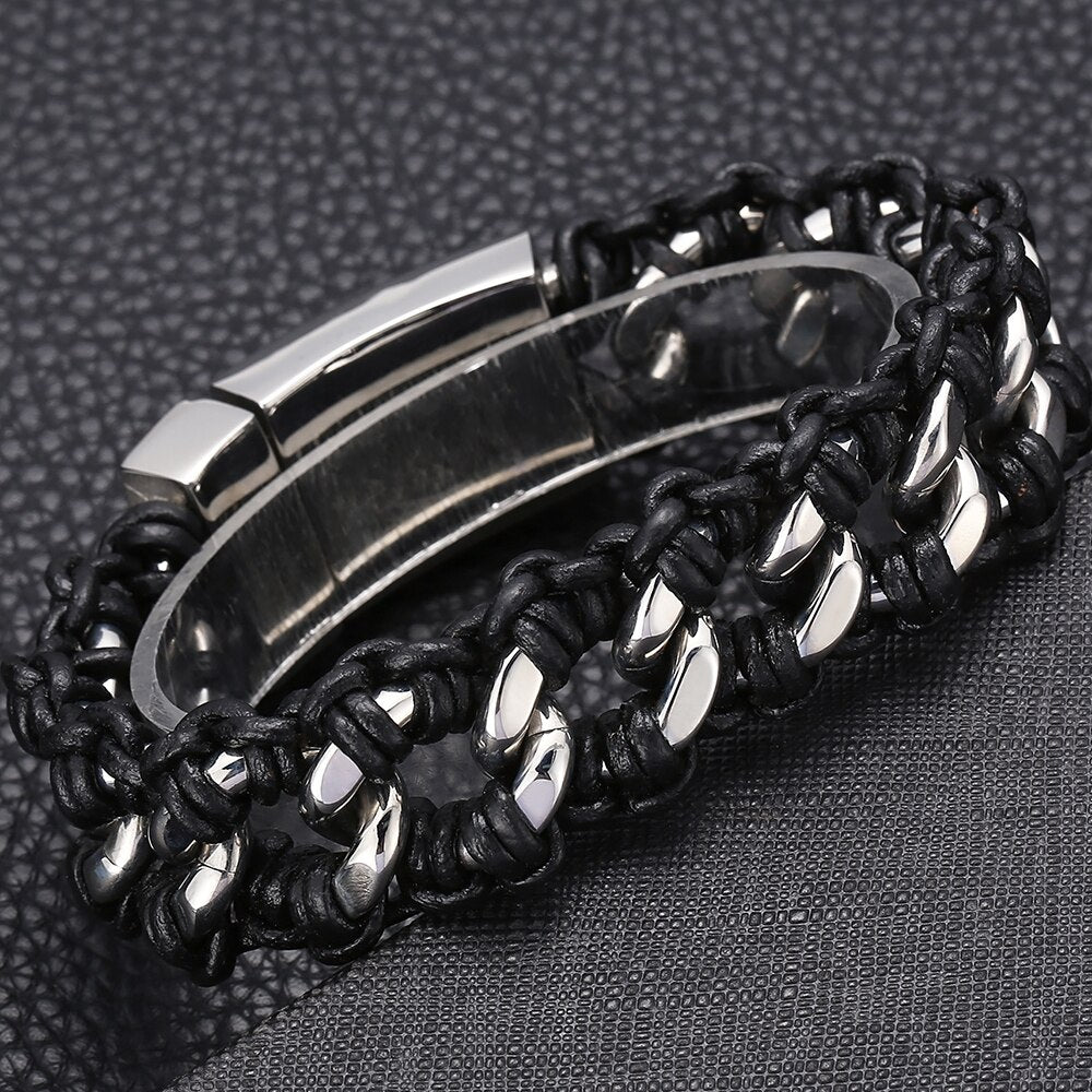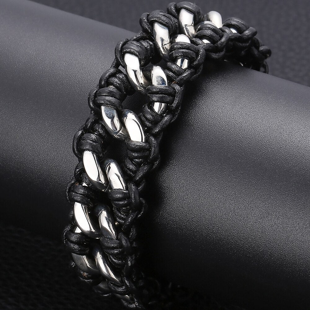 Pulsera de cuero trenzado con cadena de eslabones de acero inoxidable pulido para hombre