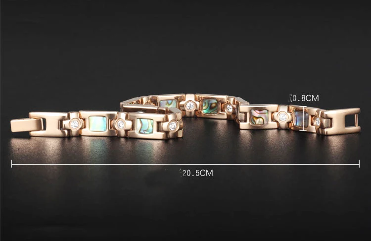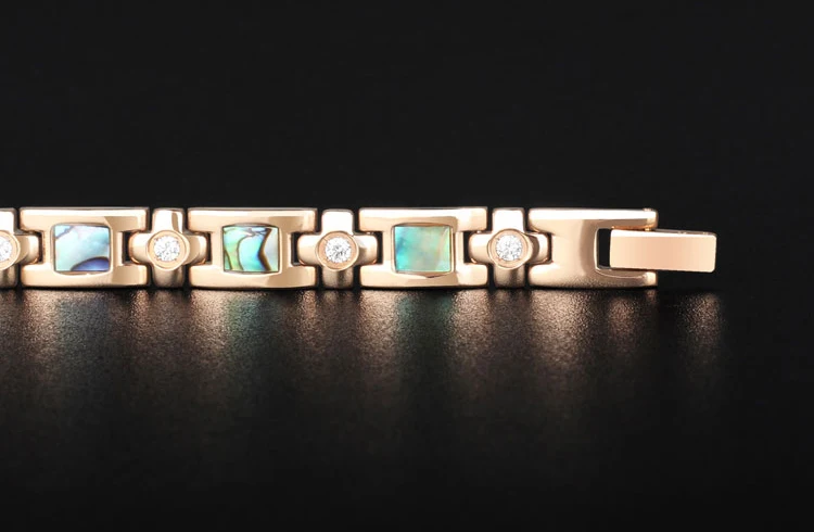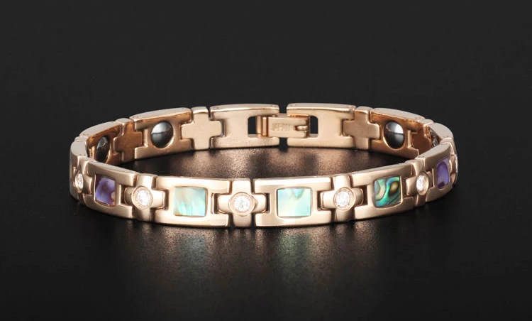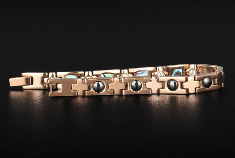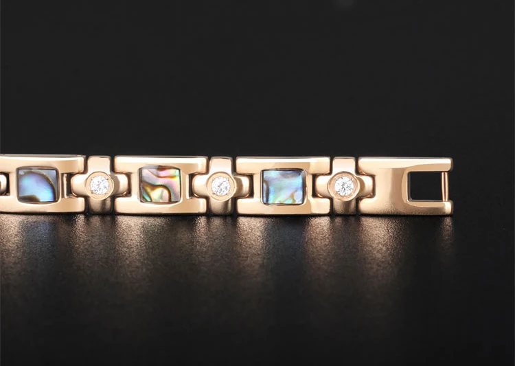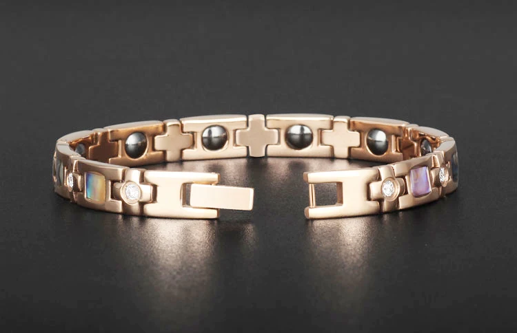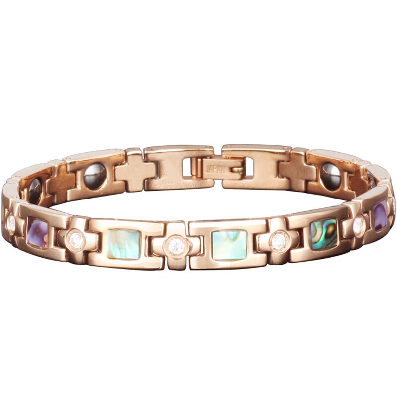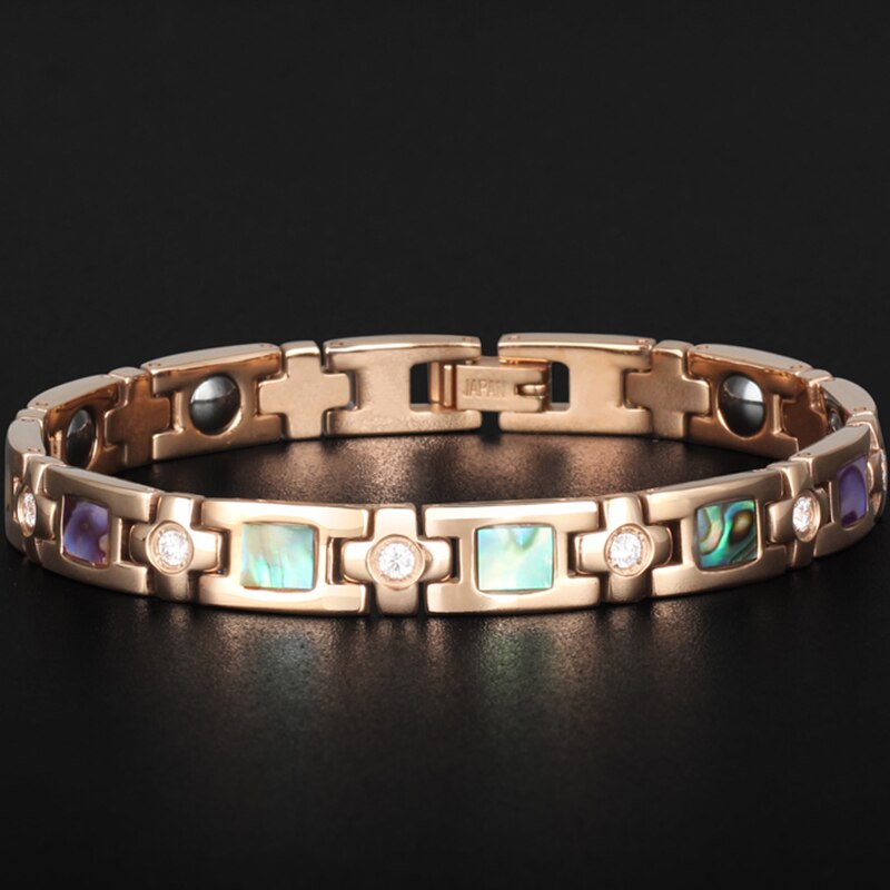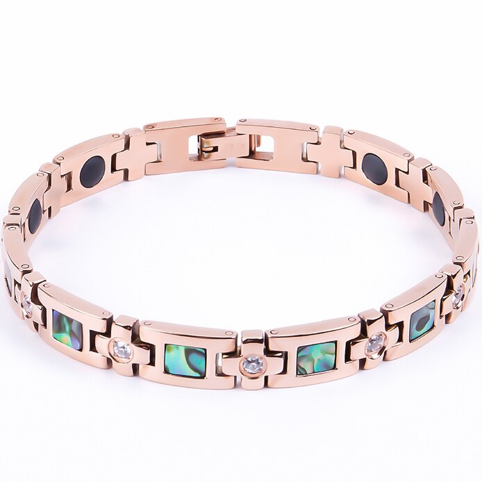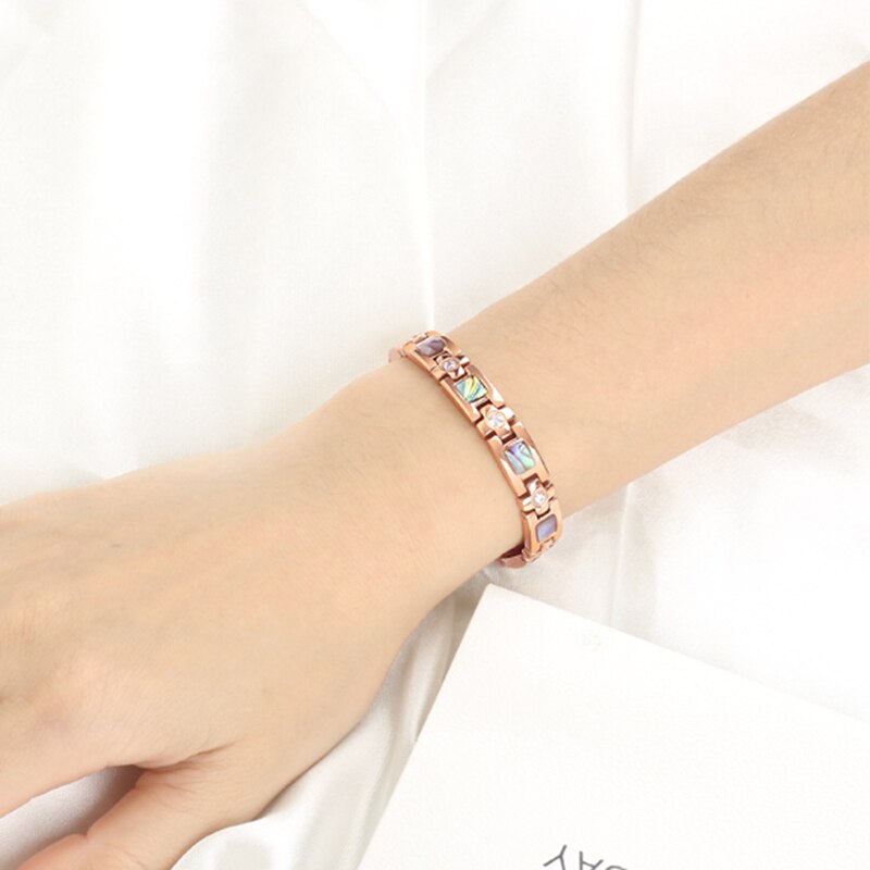 Pulsera de imanes Power Therapy para la salud femenina, con germanio y concha, de acero inoxidable chapado en oro rosa.