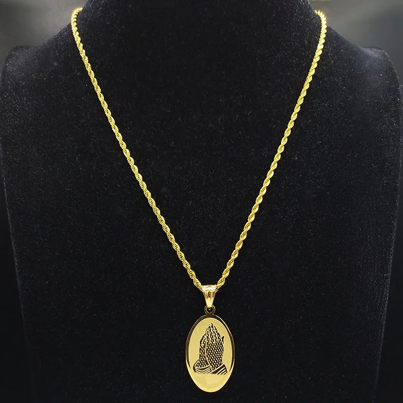 Estilo: Collar de cadena de acero inoxidable con manos en oración de Jesús