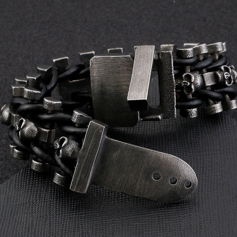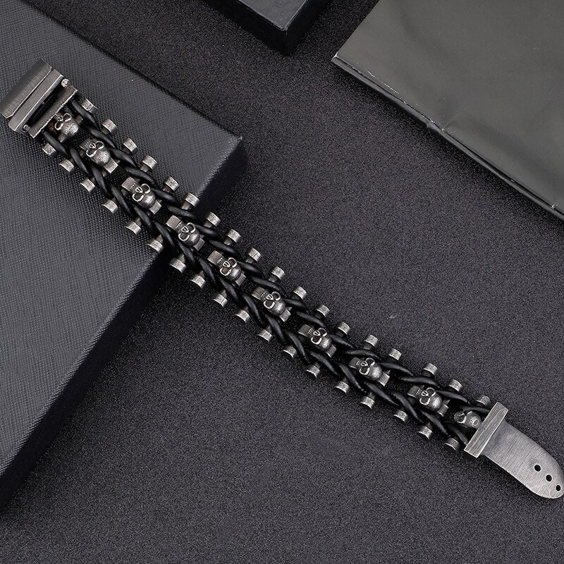 Pulsera de calavera de motociclista de acero inoxidable punk vintage de primera calidad para hombre, brazalete de cuero trenzado hecho a mano, joyería gótica masculina