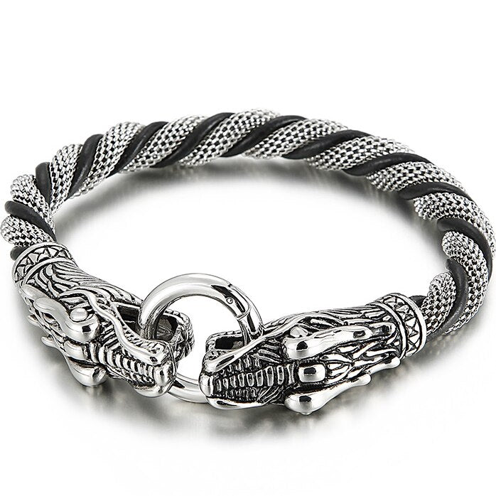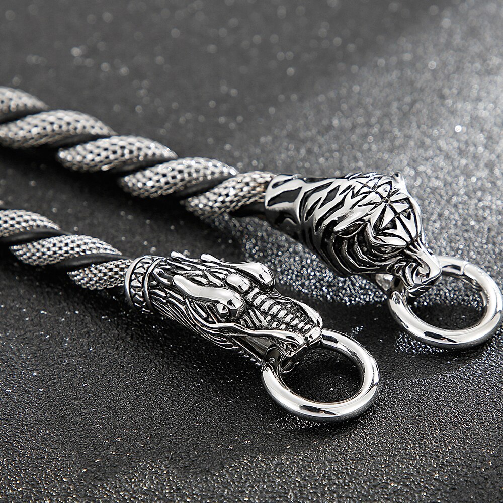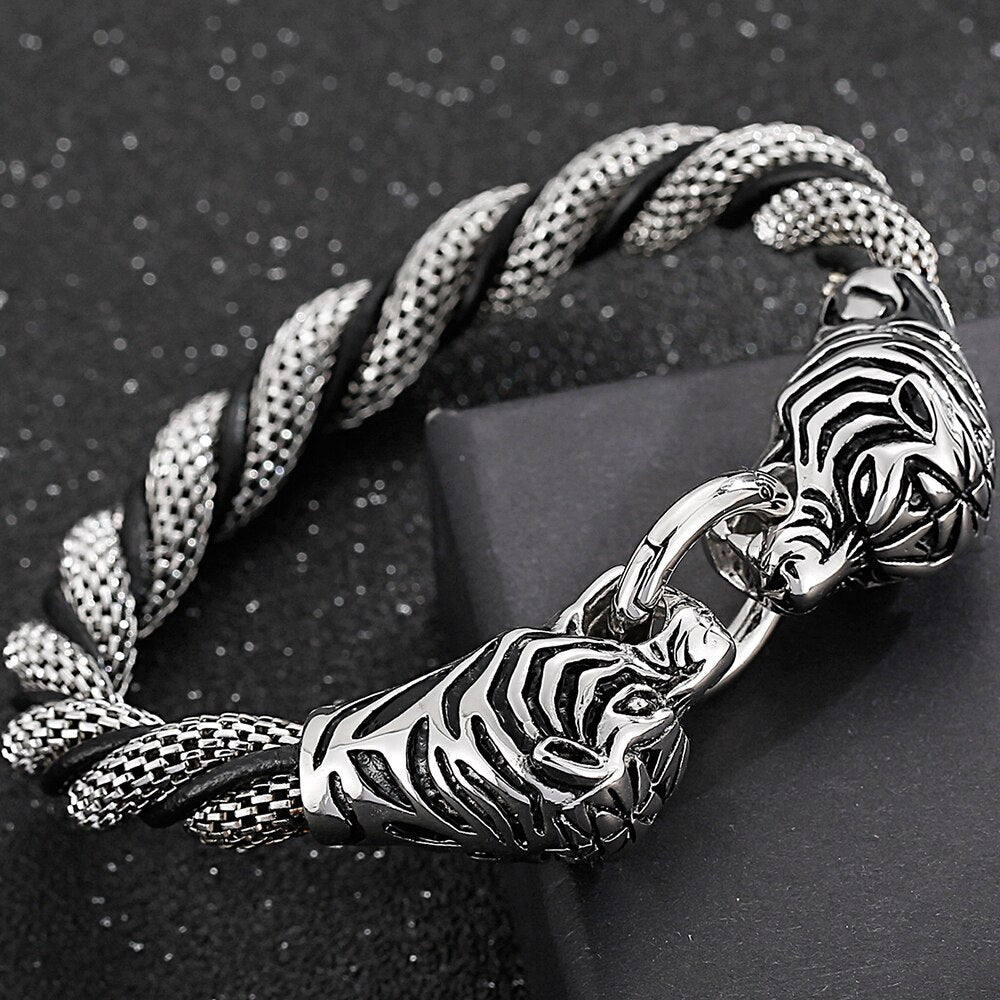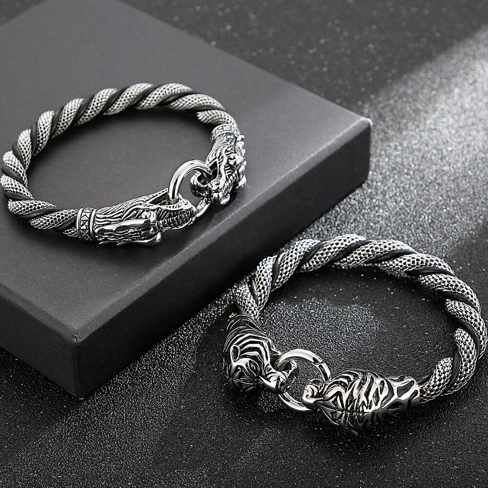 Pulsera de cuero y acero inoxidable con diseño de cabeza de dragón y tigre para hombre, estilo punk, estilo motero.