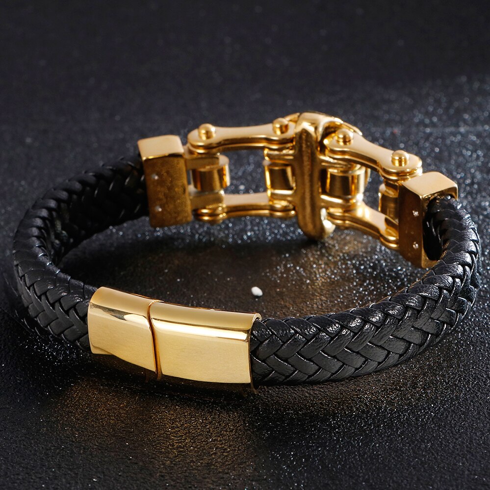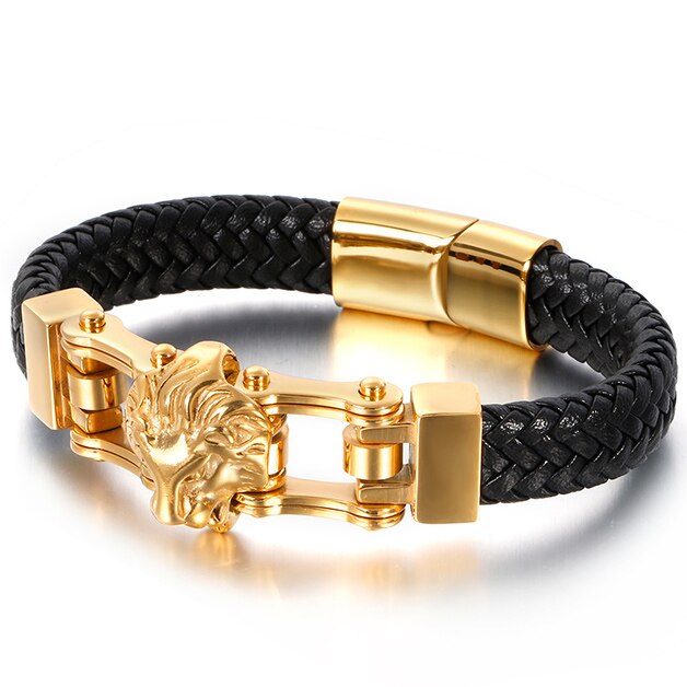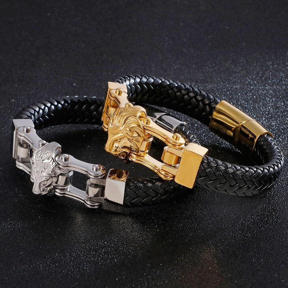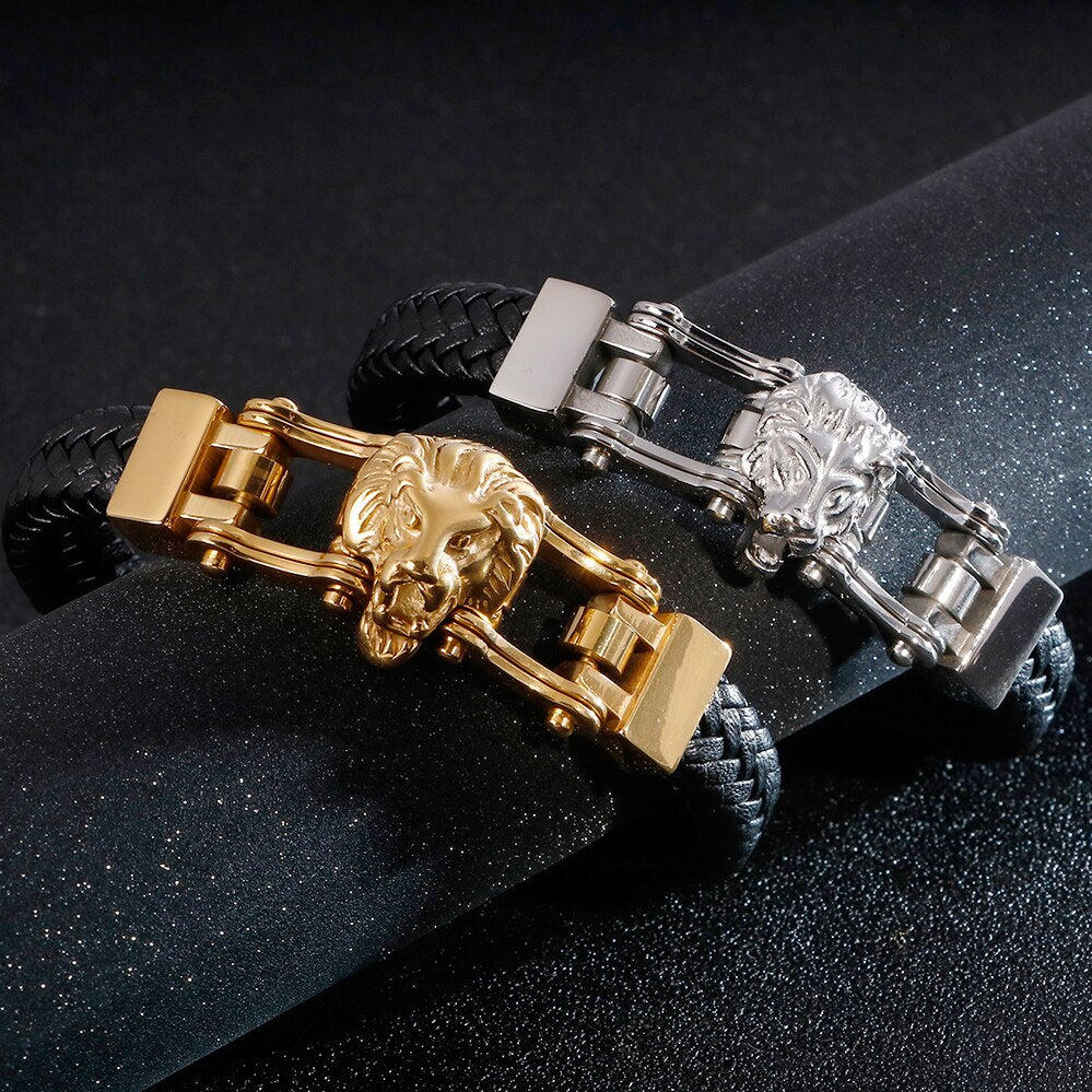 Pulseras y brazaletes punk góticos con cabeza de león para hombre, pulsera trenzada de cuero genuino, cadena de bicicleta de acero inoxidable color dorado para hombre, joyería