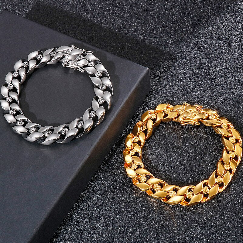 Pulsera de cadena de eslabones estilo punk gótico de acero inoxidable con cabeza de calavera para hombre