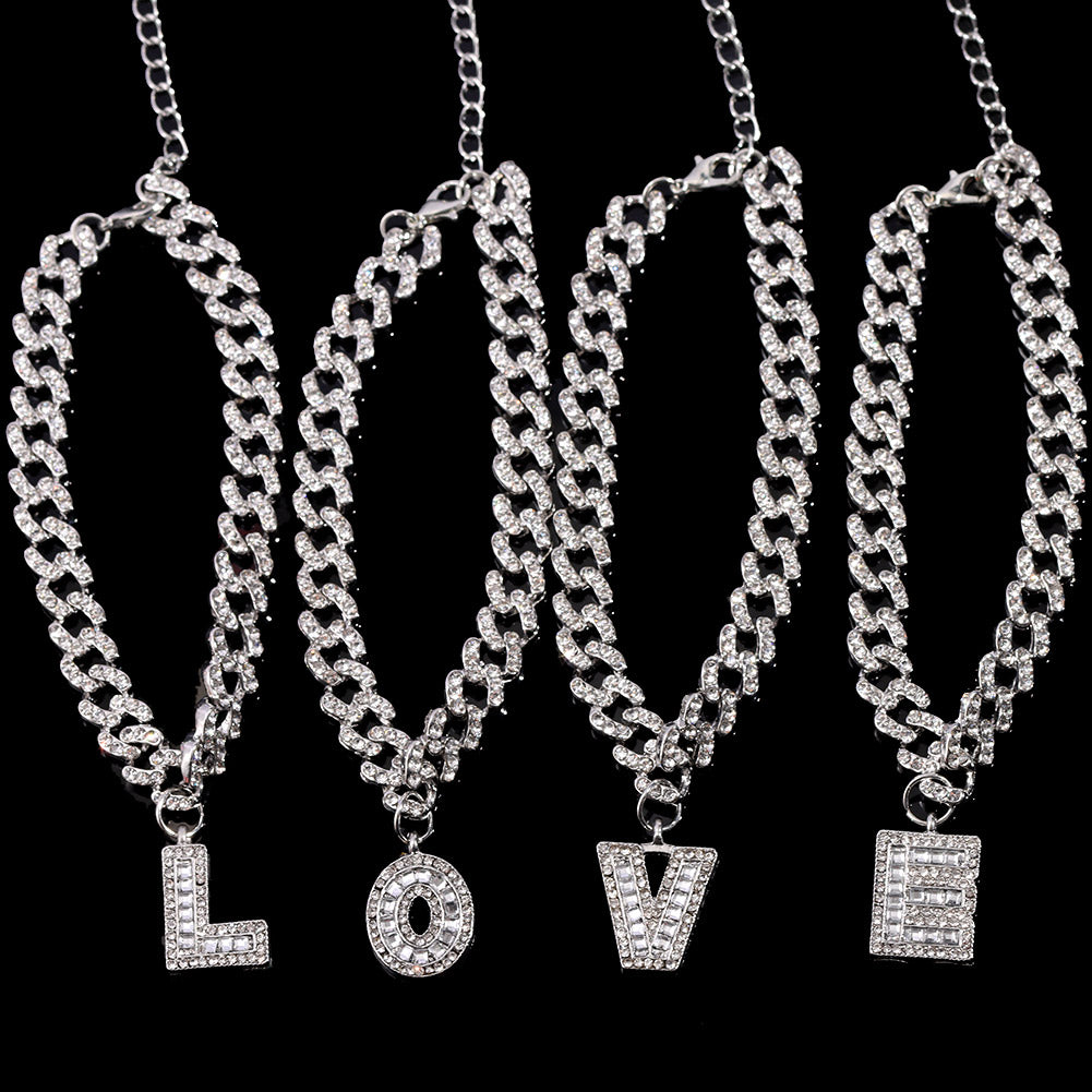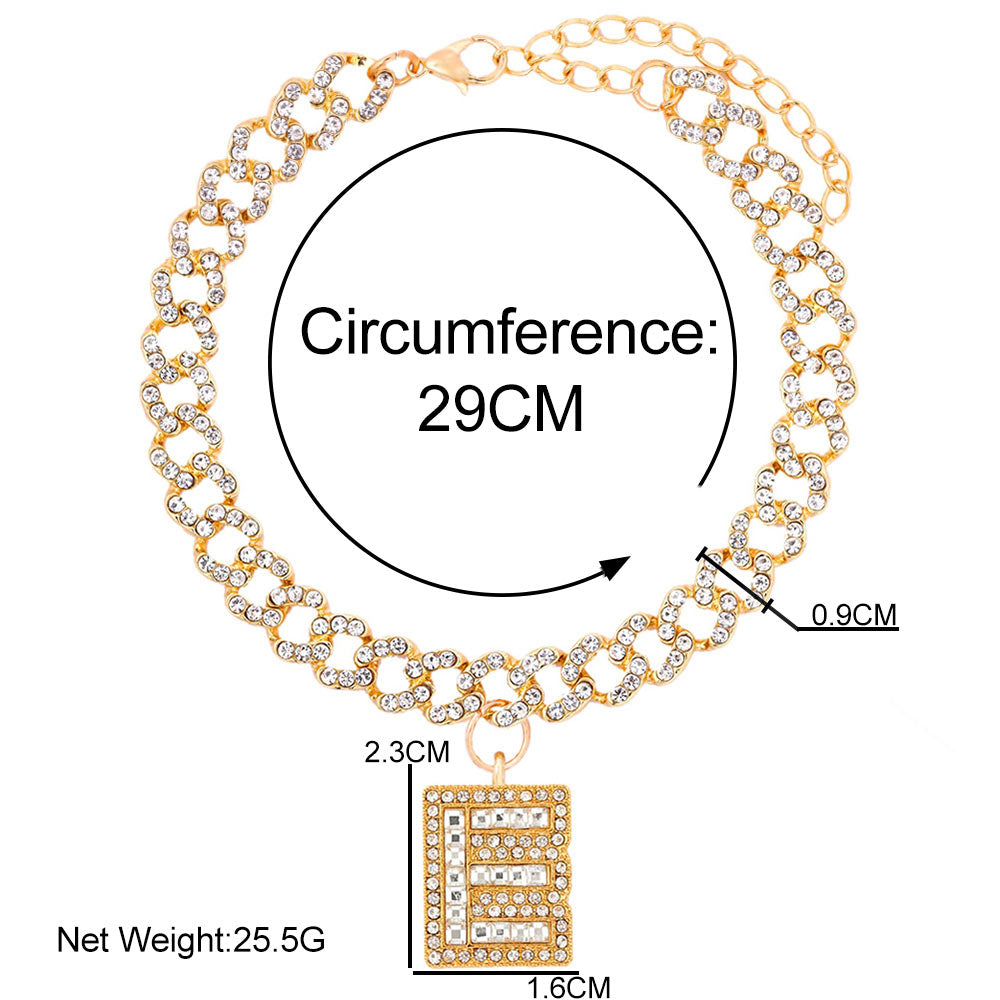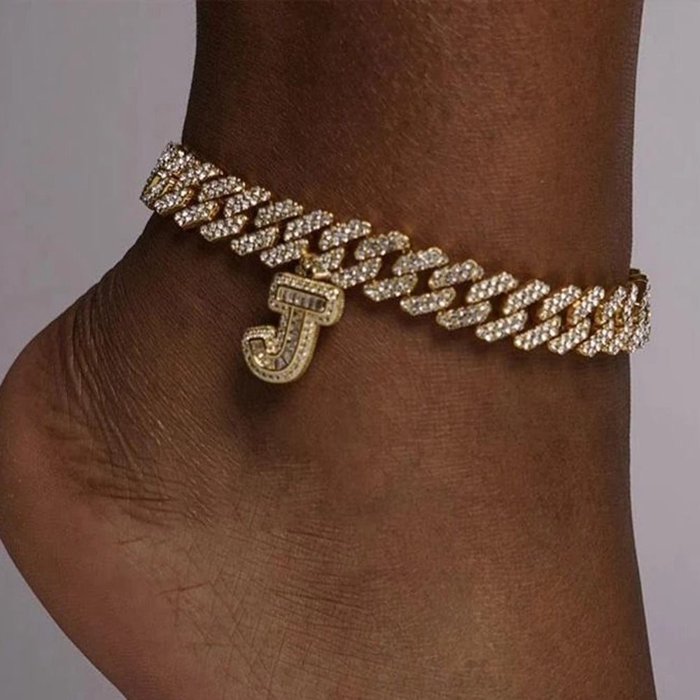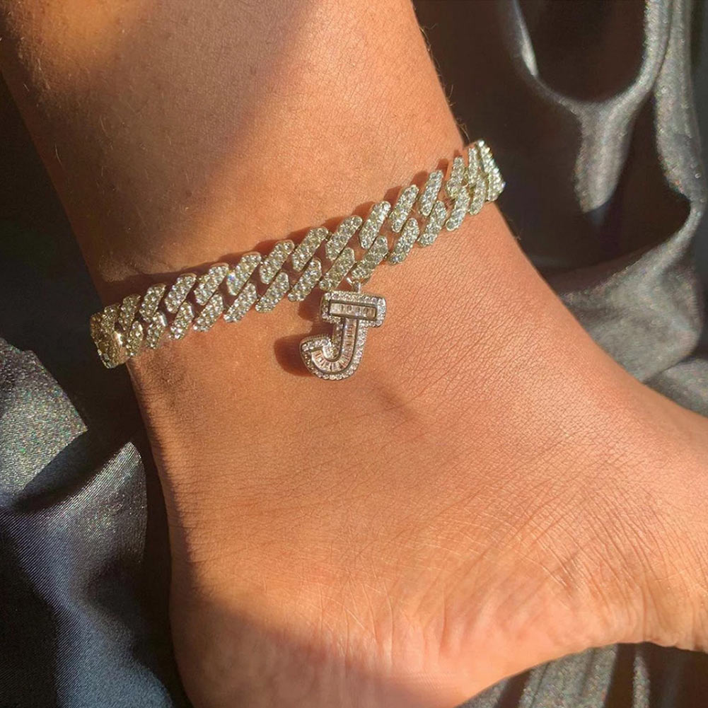 Tobilleras estilo punk hip hop con cristales gruesos y letras iniciales para mujer, con diamantes de imitación dorados y plateados, pulsera cubana para tobillo, joyería