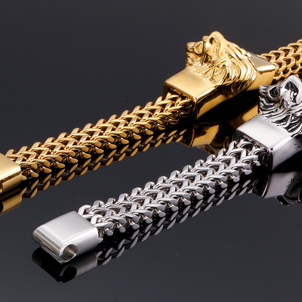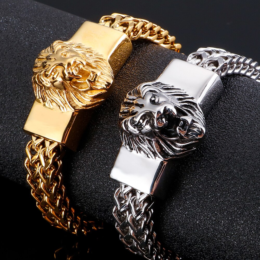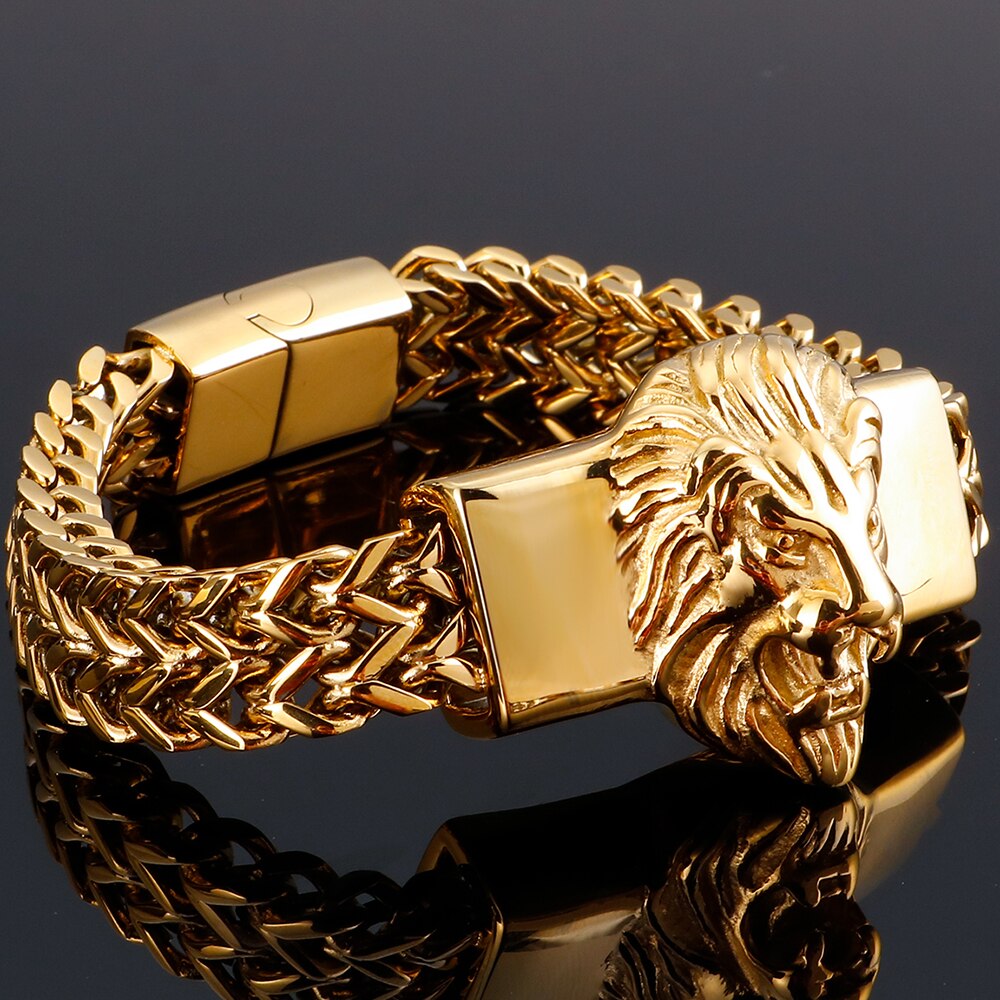 Pulsera punk de hombre con cabeza de león, de acero inoxidable chapado en oro, ideal para moteros.