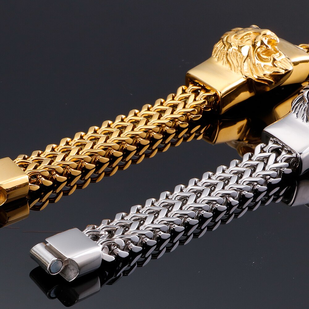 Pulsera Punk para hombre con cabeza de león, de acero inoxidable chapado en oro, para motociclistas, con cierre magnético.