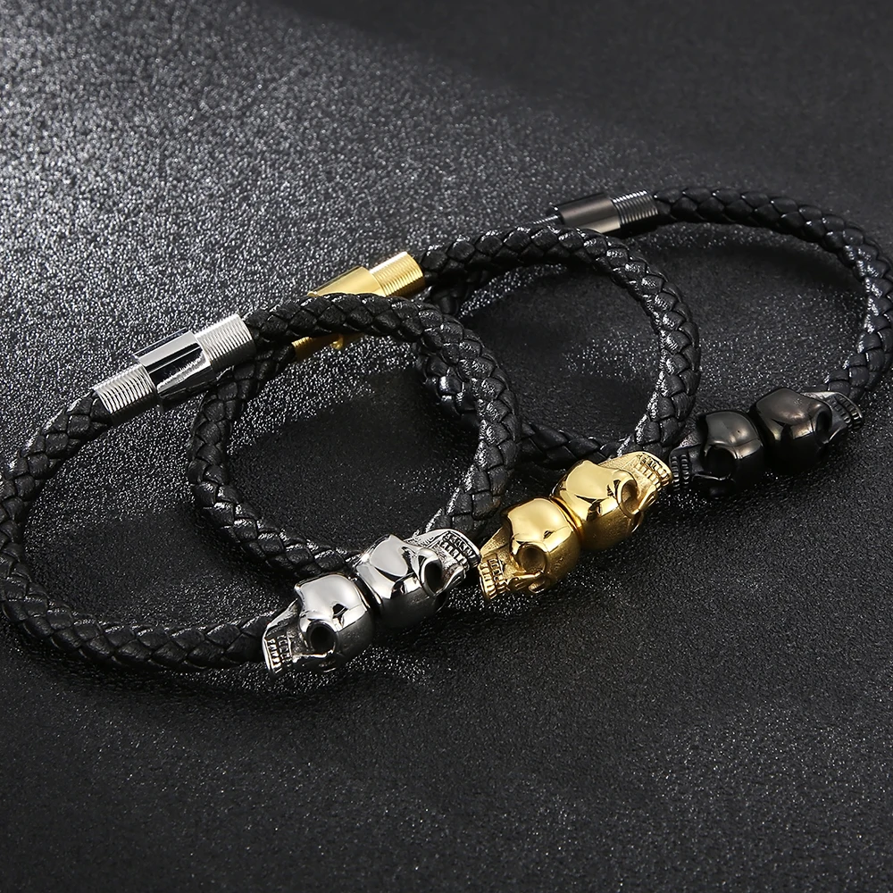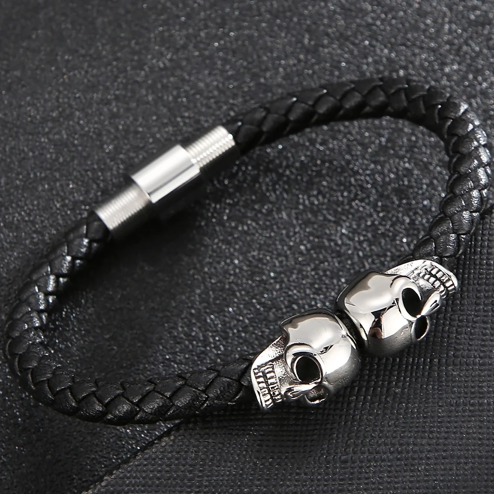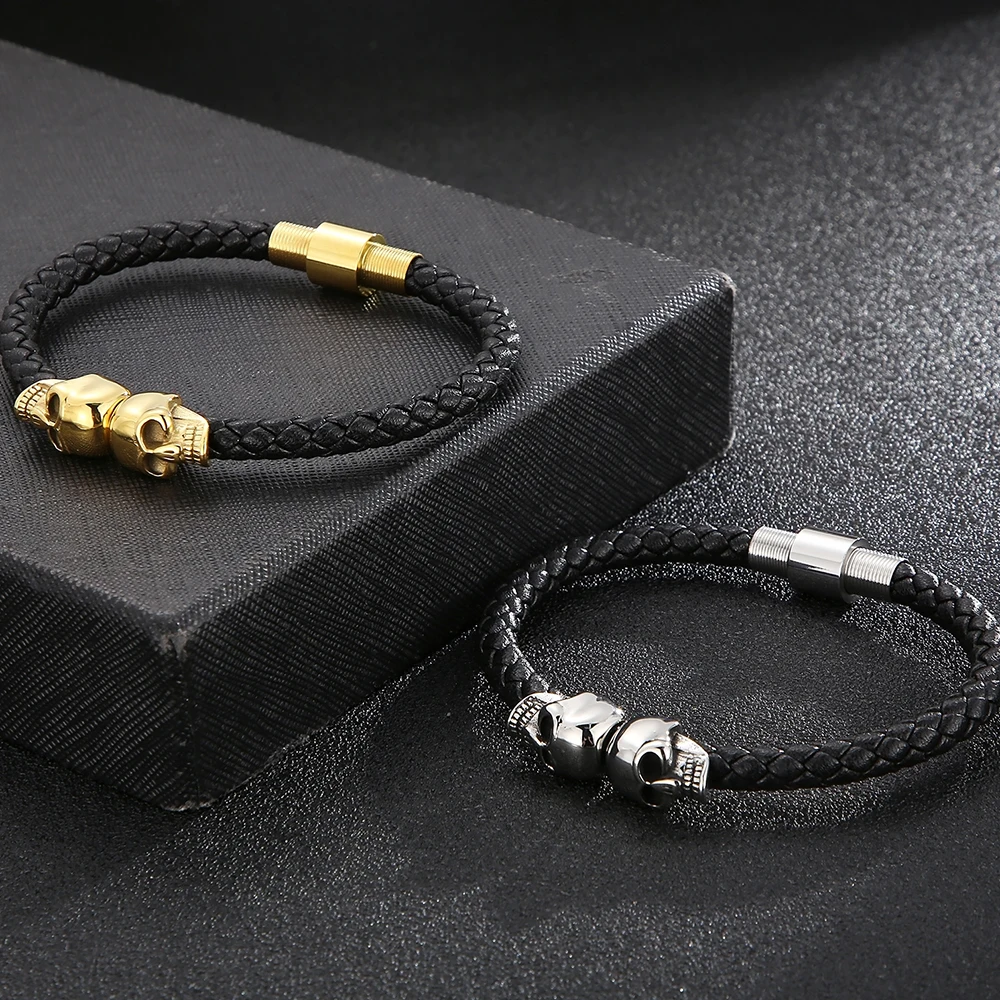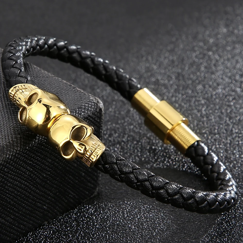 Pulsera de cuero genuino con dije de punk rock para hombre, brazalete de calavera para hombre, cierre magnético de acero inoxidable, regalo de cumpleaños para novio