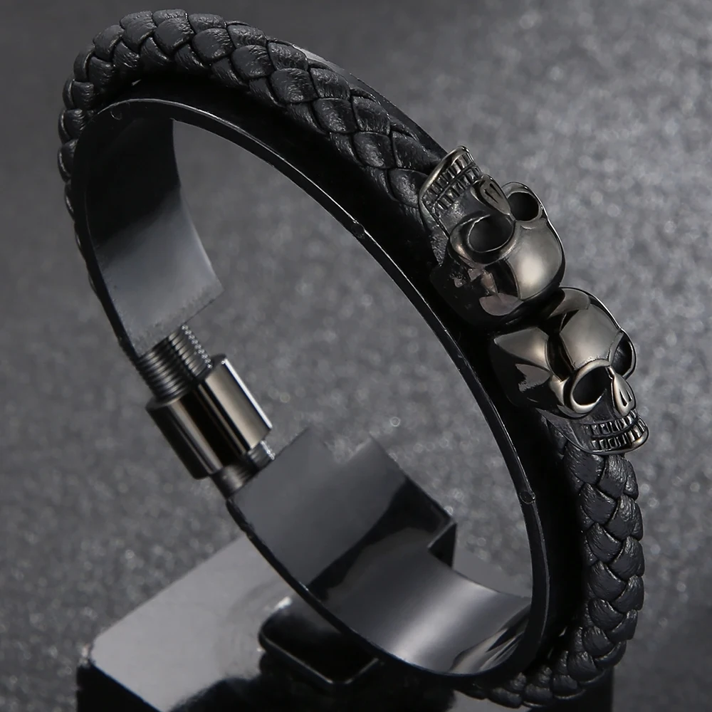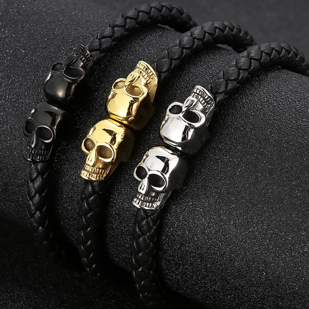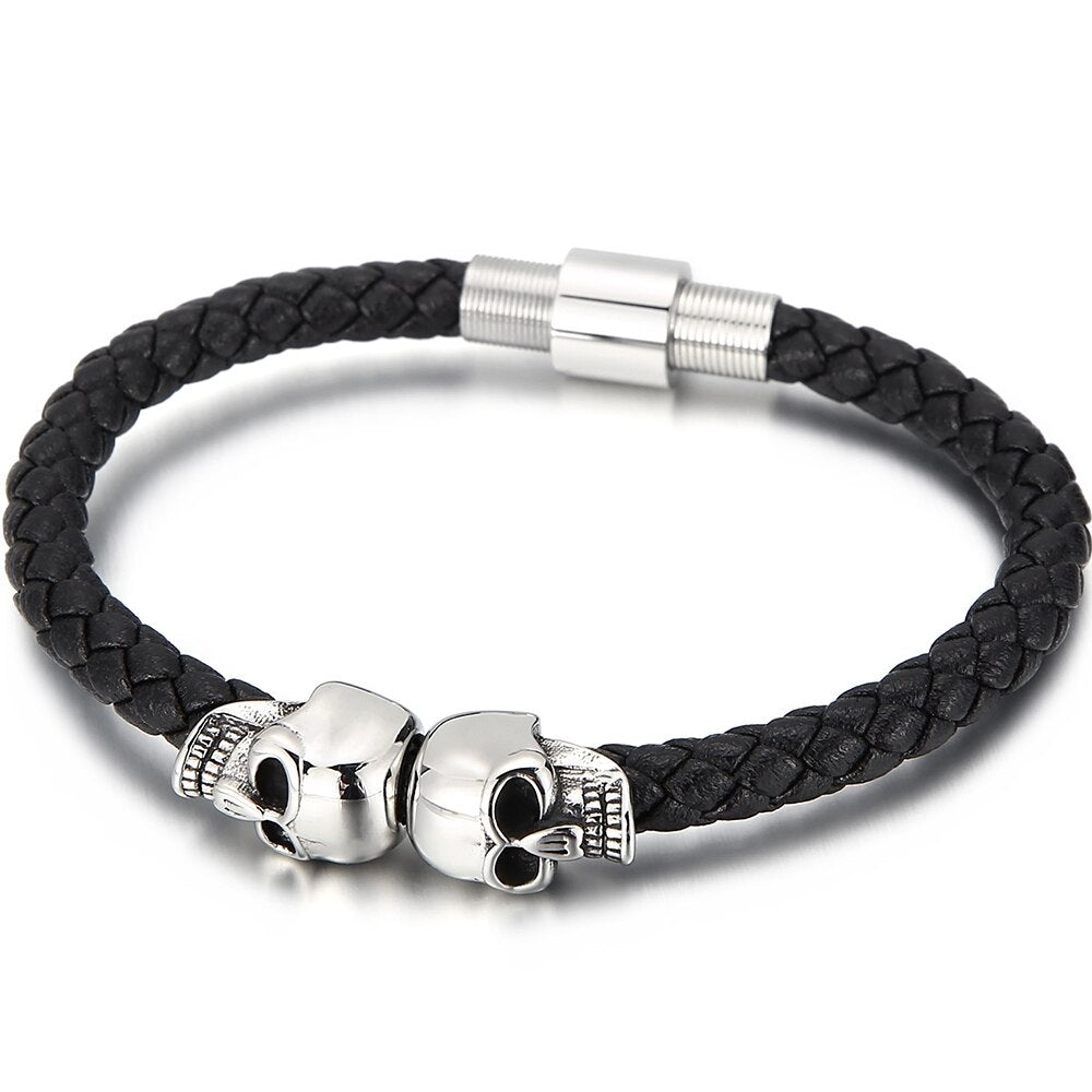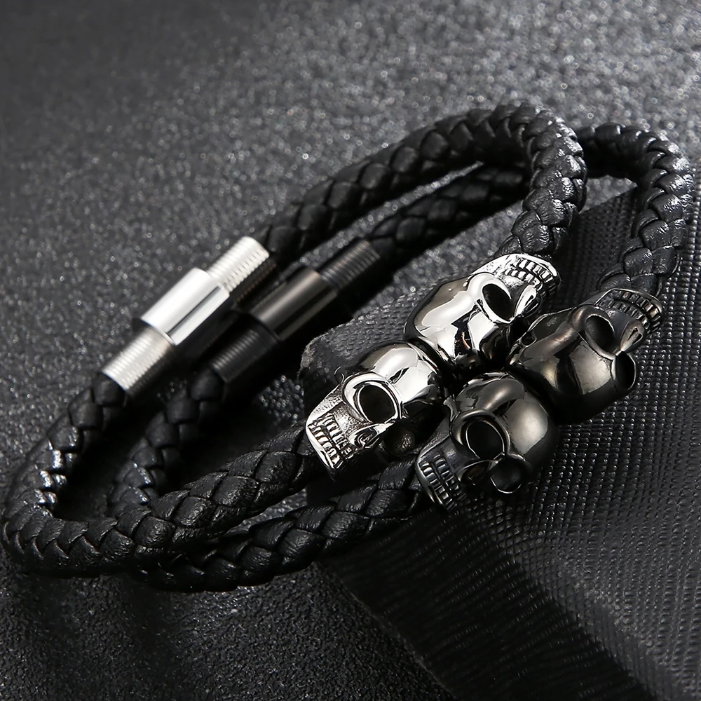 Pulsera de cuero genuino con dije de punk rock para hombre, brazalete de calavera para hombre, cierre magnético de acero inoxidable, regalo de cumpleaños para novio