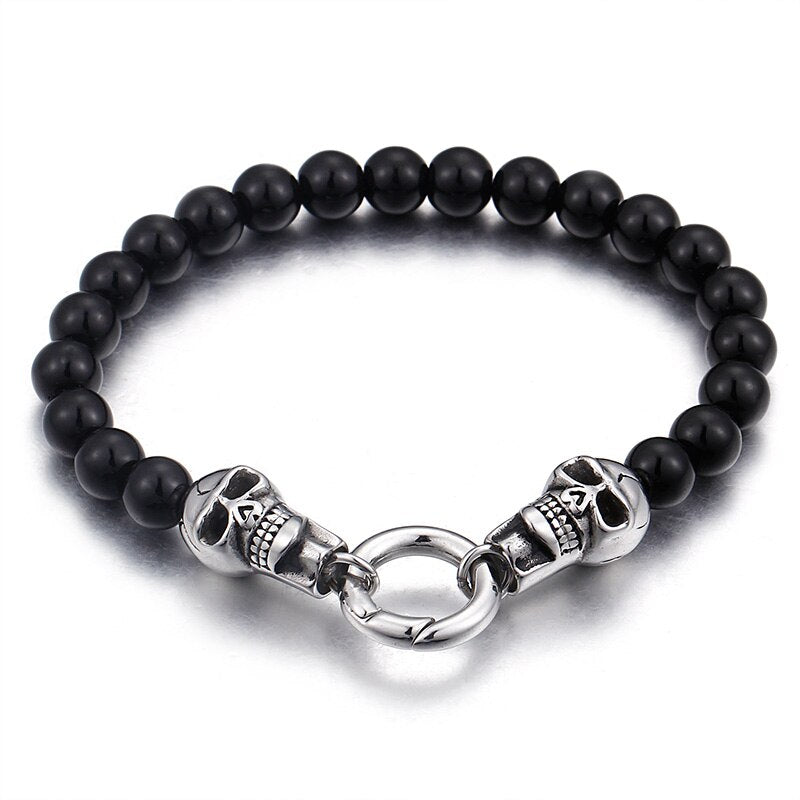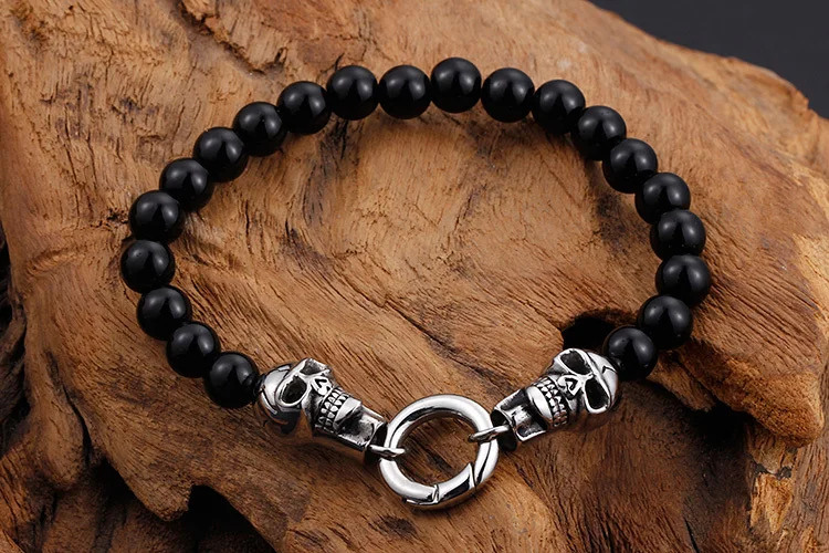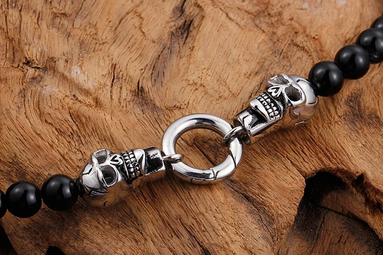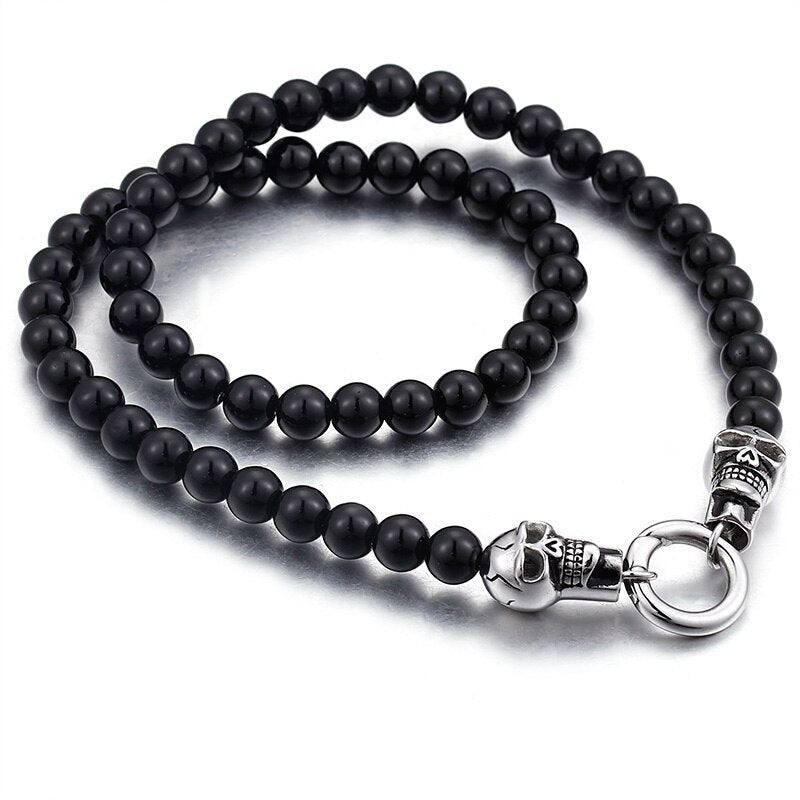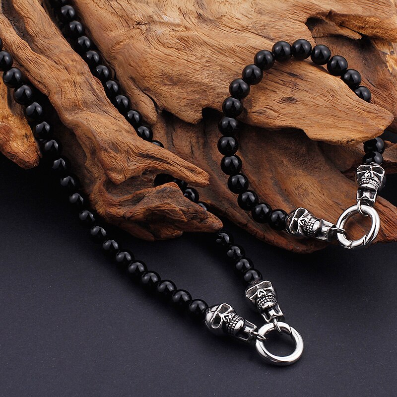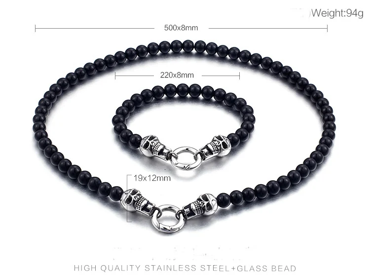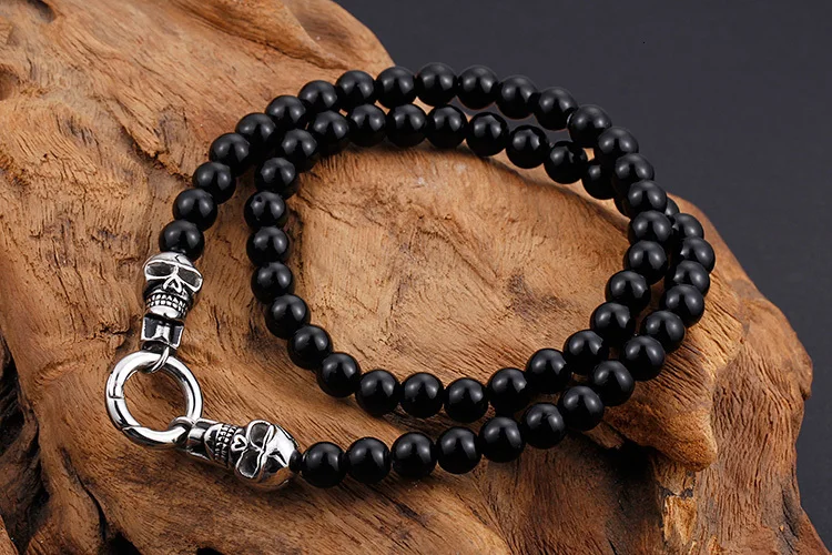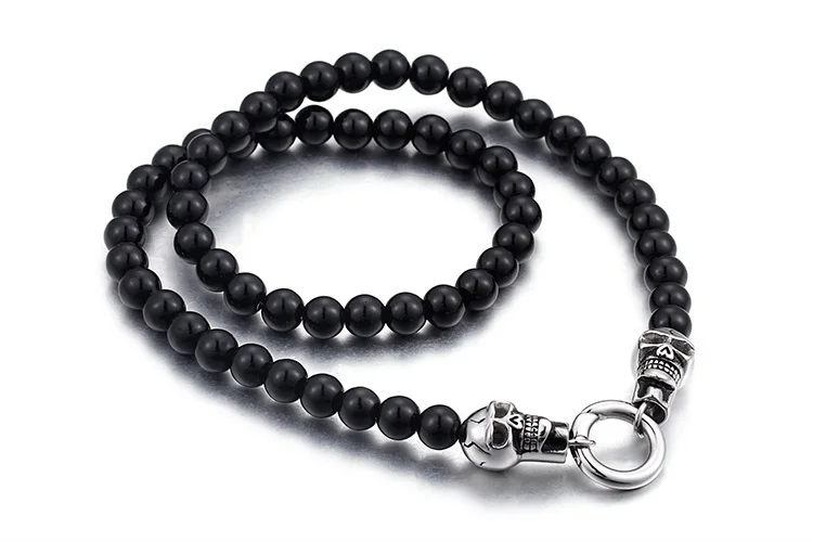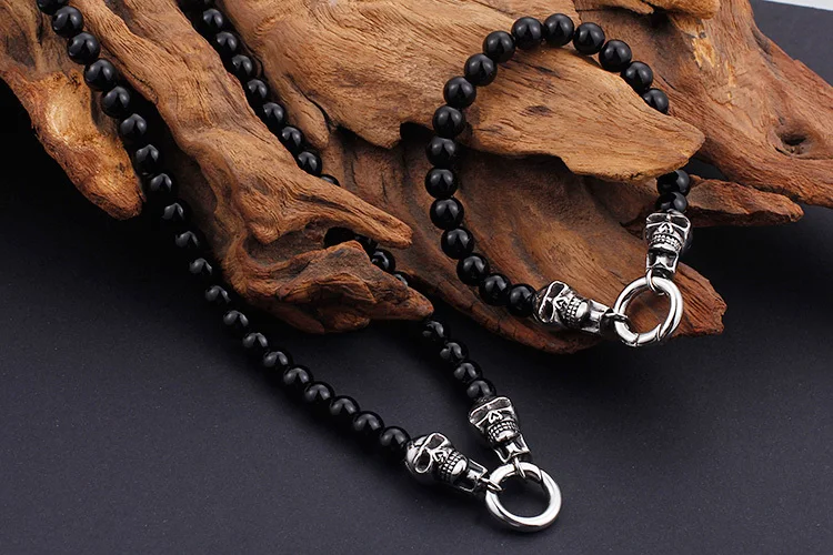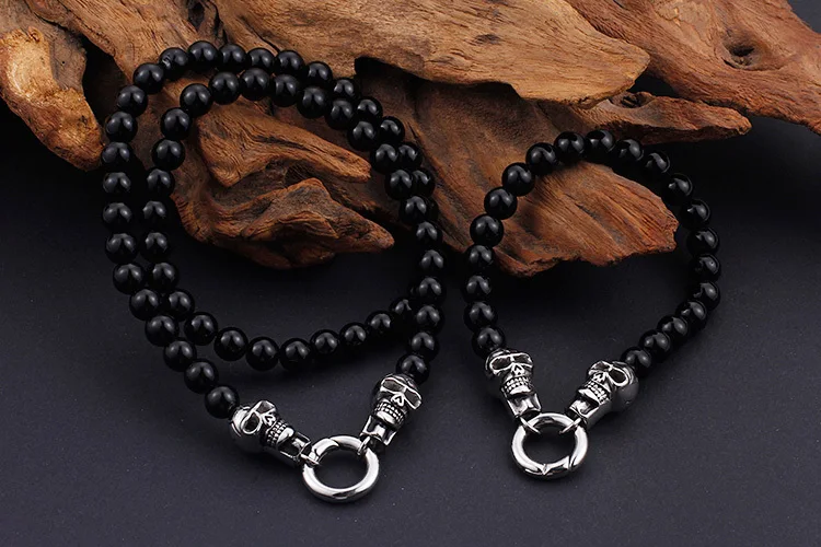 Conjuntos de joyería punk rock de acero inoxidable con doble calavera y collar para hombre, cuentas negras de 8 mm.