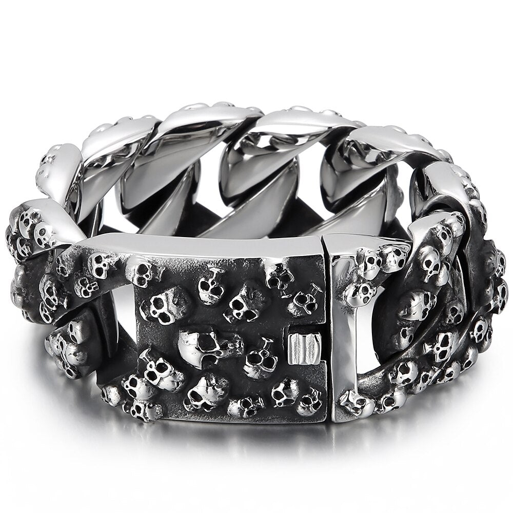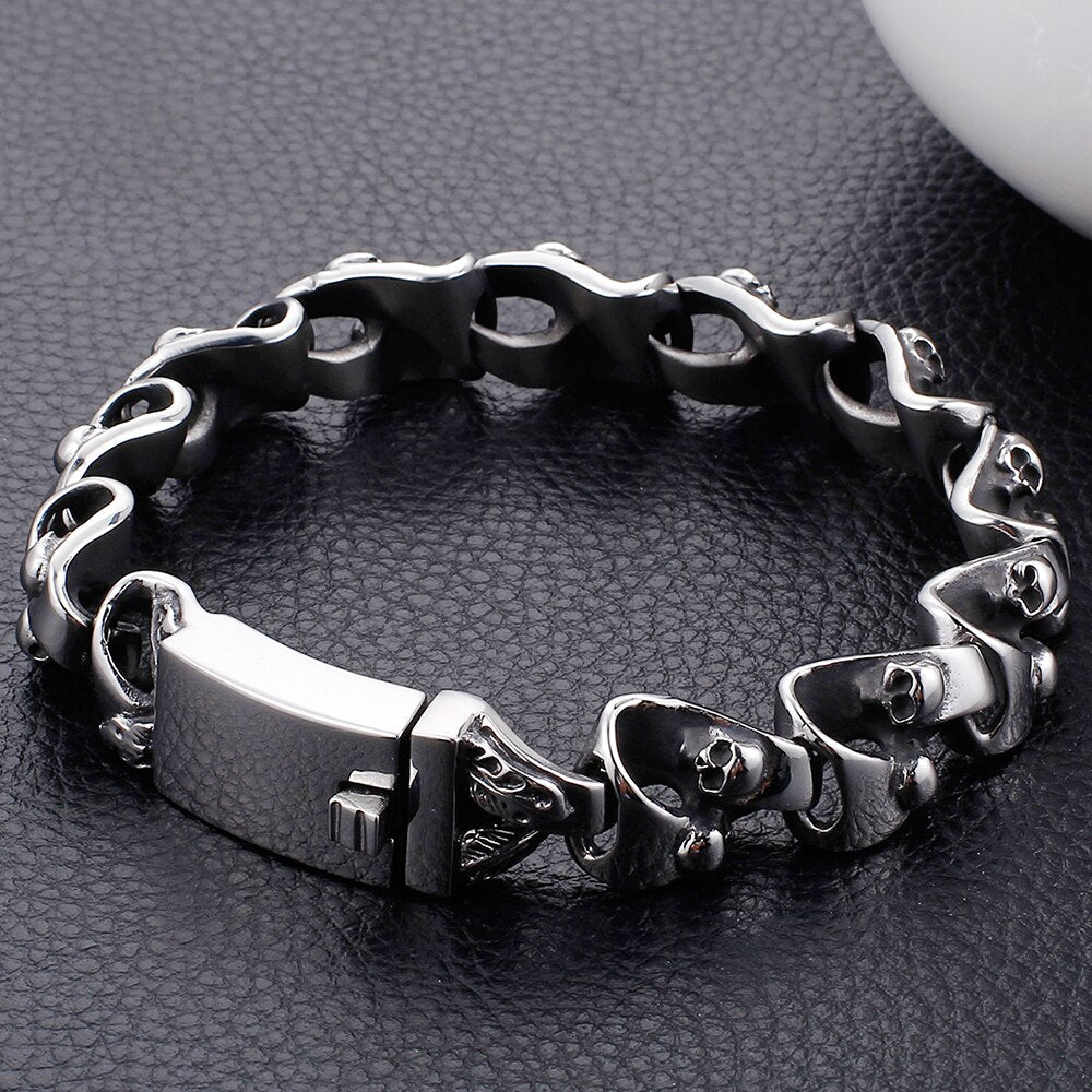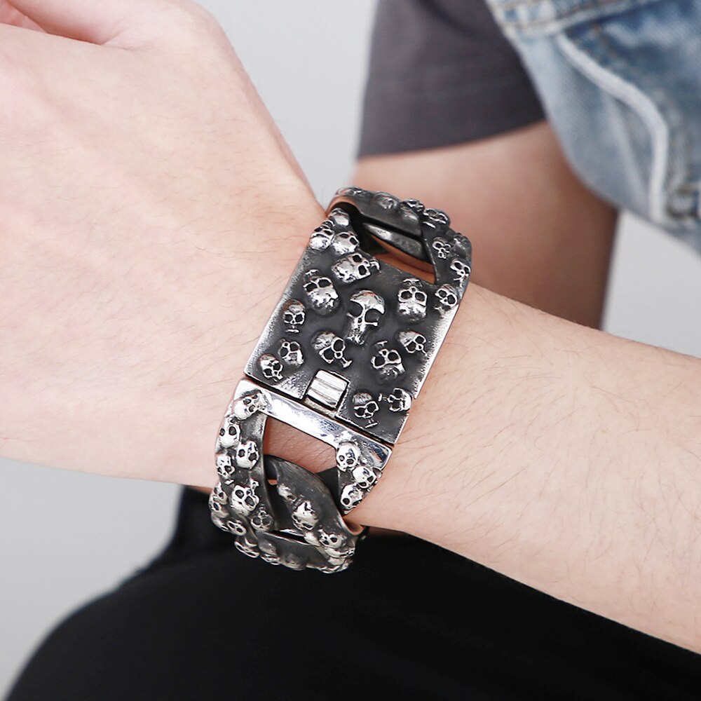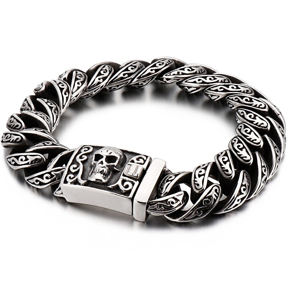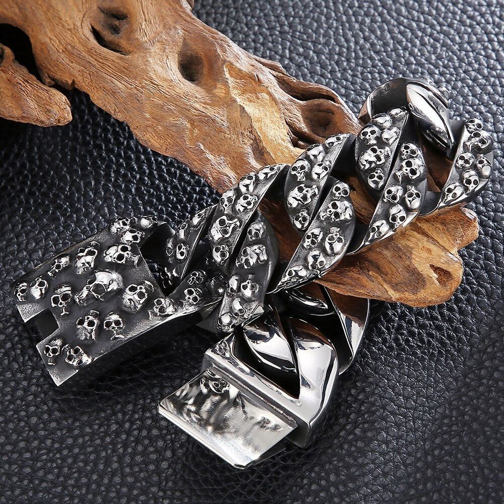 Pulsera de hombre punk rock de acero inoxidable macizo con cadena ancha de calavera para hombre
