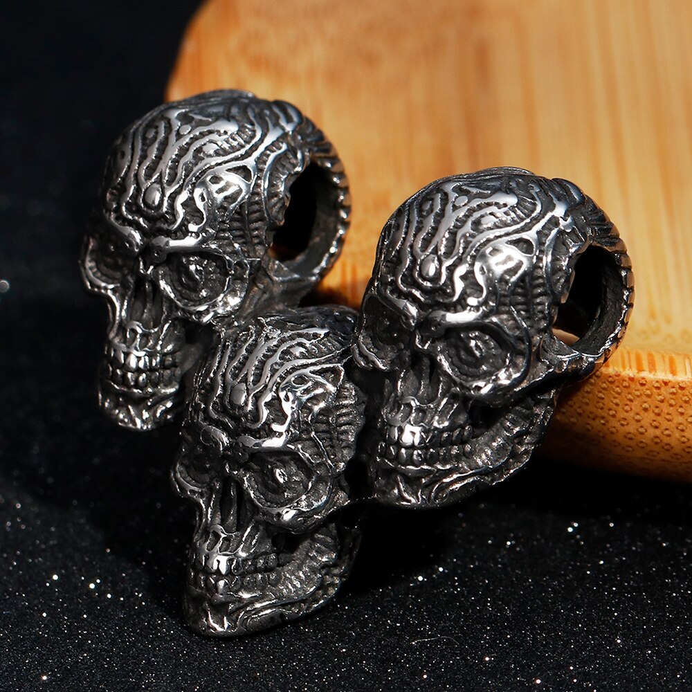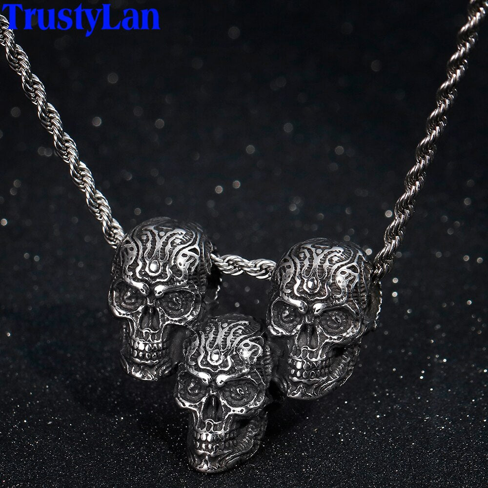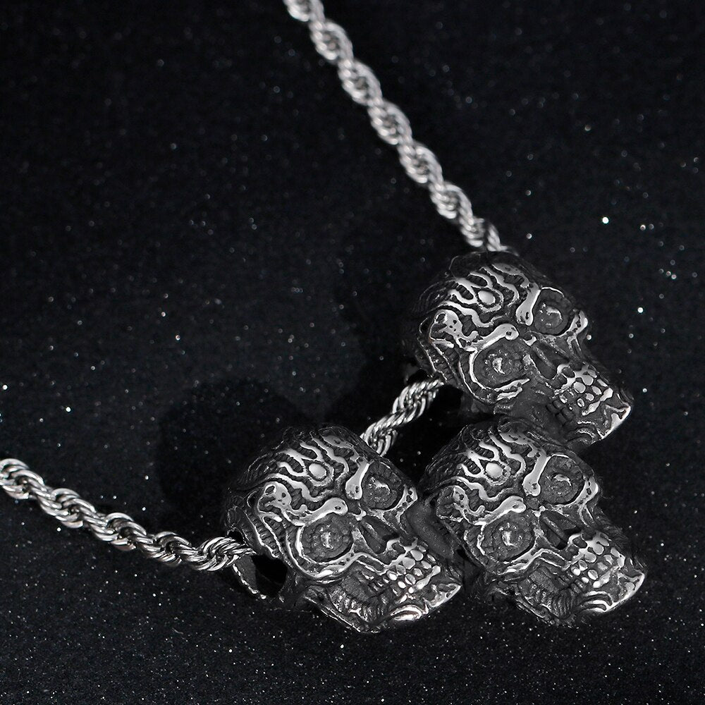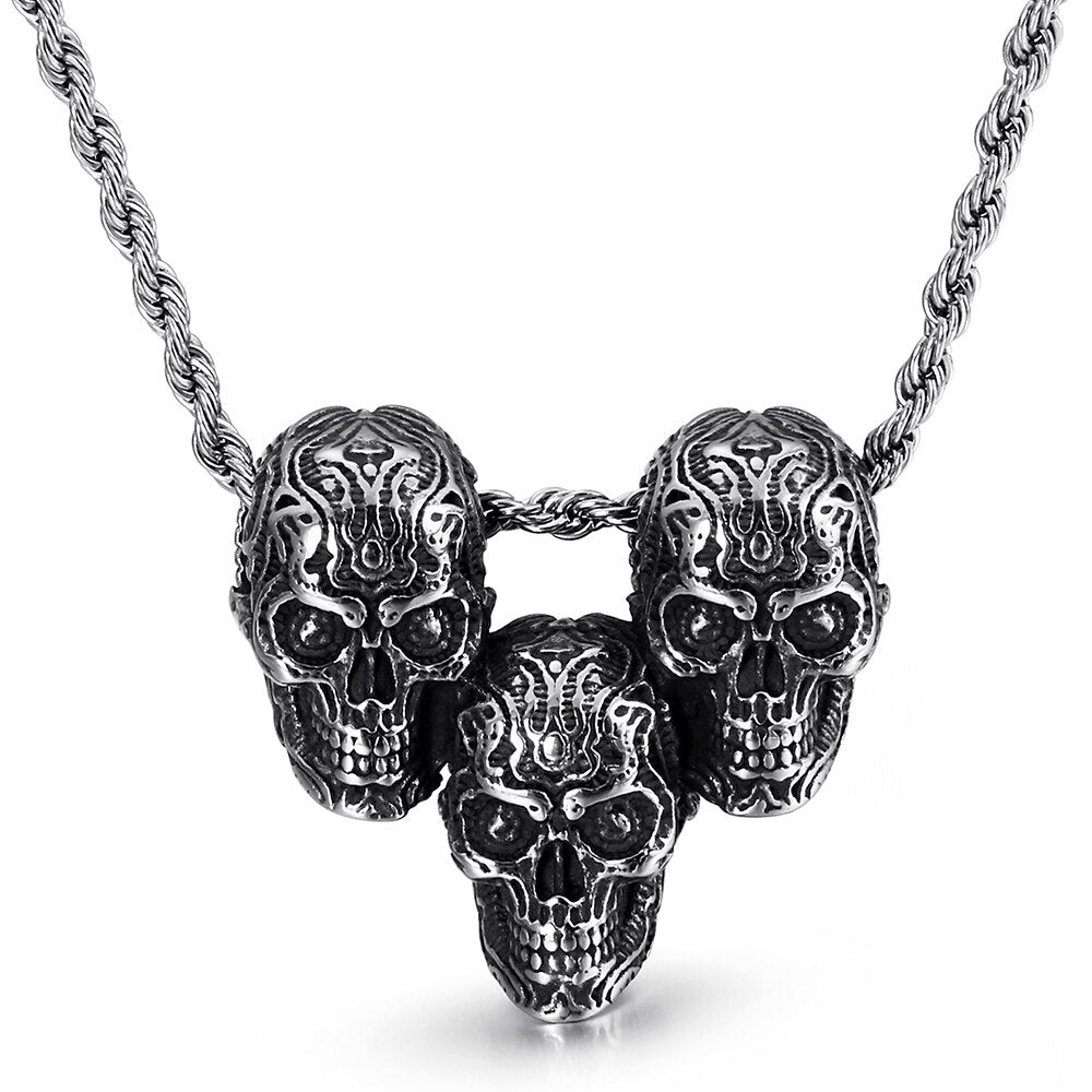 Collar con colgante de tres calaveras estilo punk rock para hombre, joyería vintage de acero inoxidable para discotecas y fiestas, collares de 60 cm de largo.