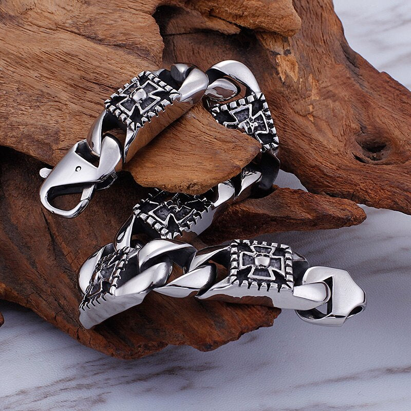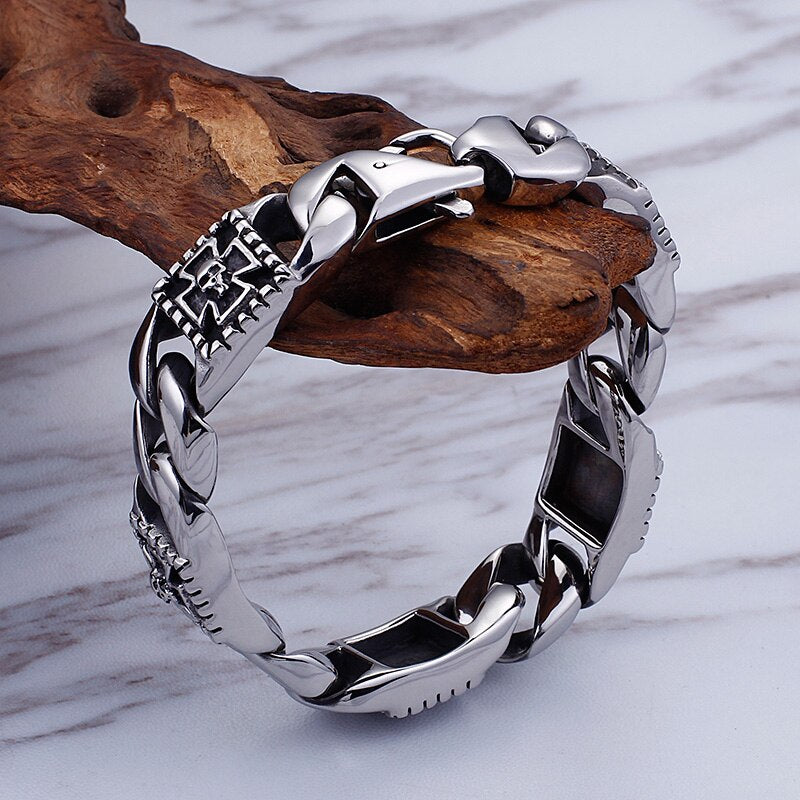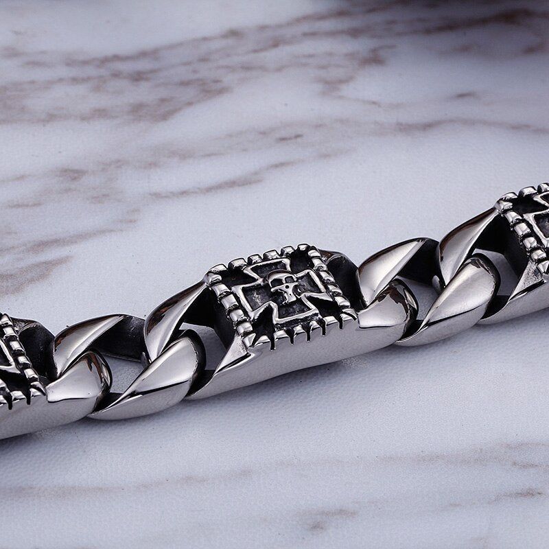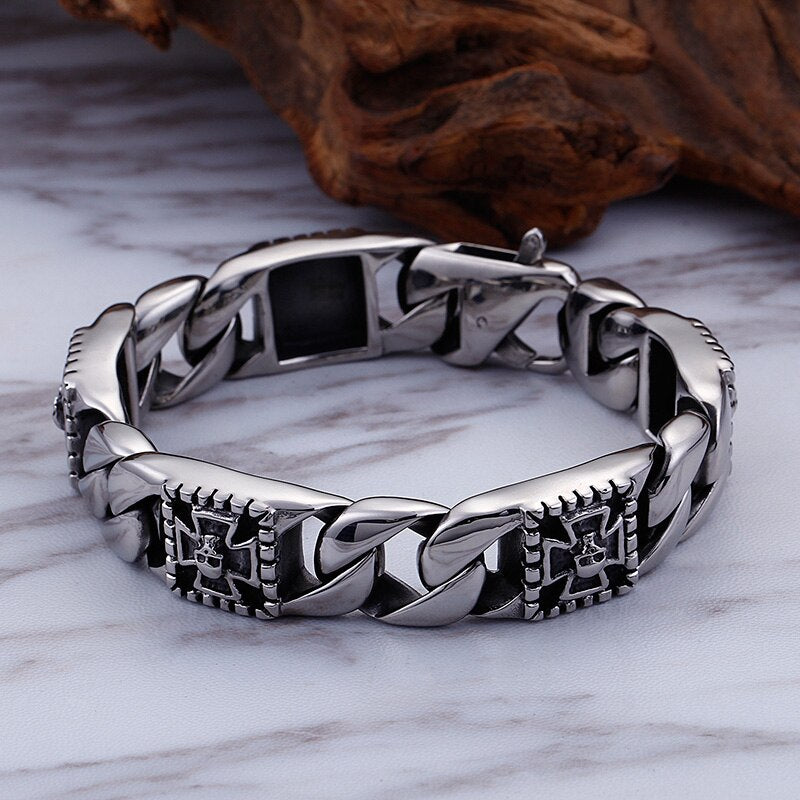 Pulsera de acero inoxidable con diseño de calavera y esqueleto de estilo punk rockero e hippie para hombre, ideal como joyería para bicicleta o como brazalete con cadena fantasma.