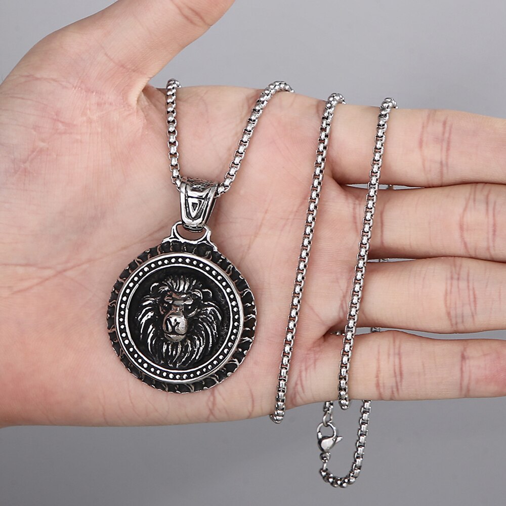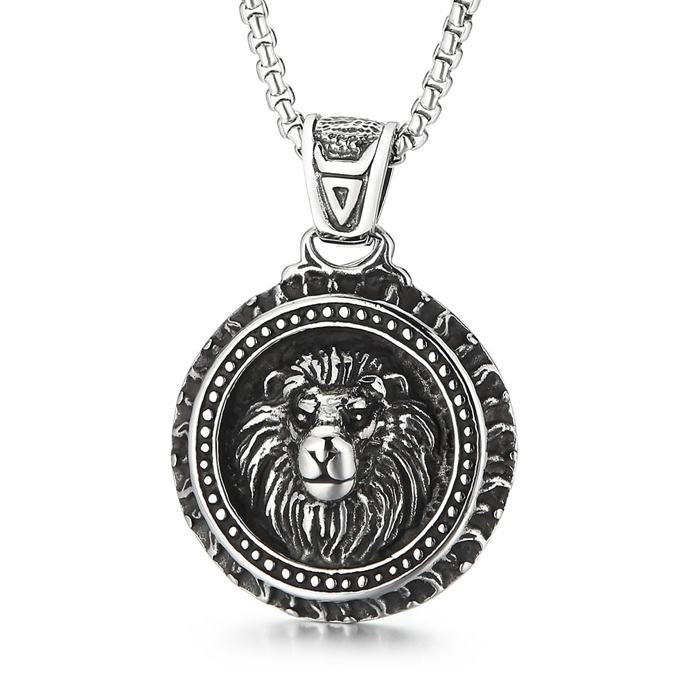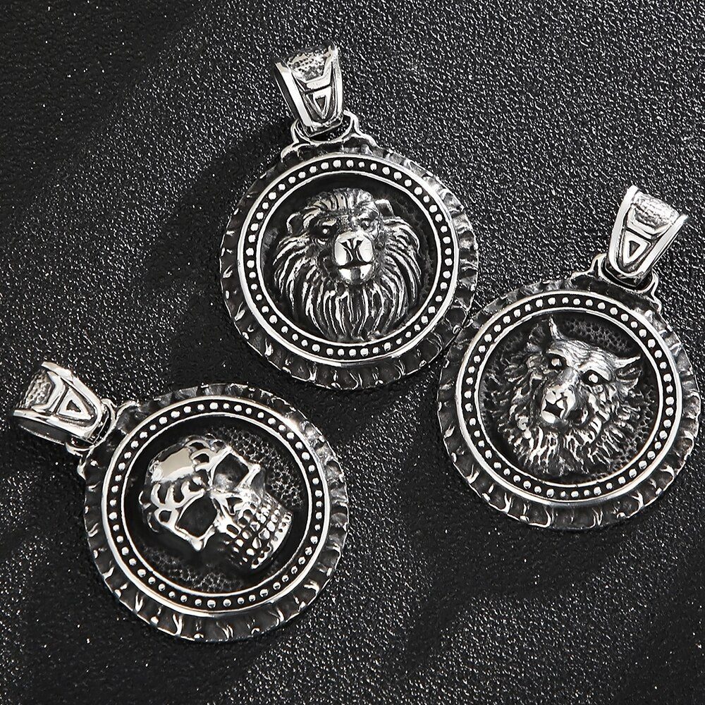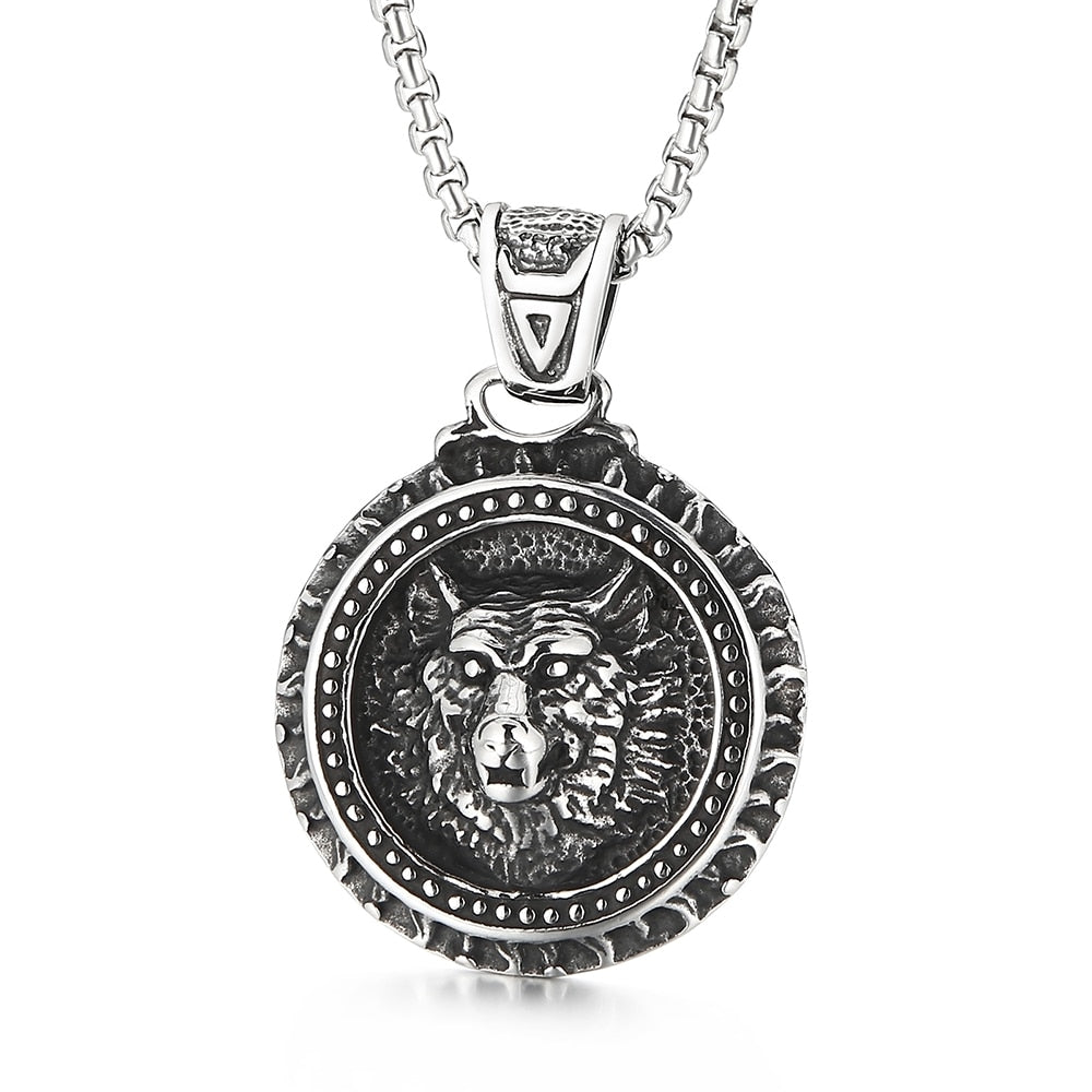 Collar con colgante de cabeza de león y calavera punk para hombre, de acero inoxidable, con cabeza de lobo, de 60 cm de largo, joyería vikinga de animales.