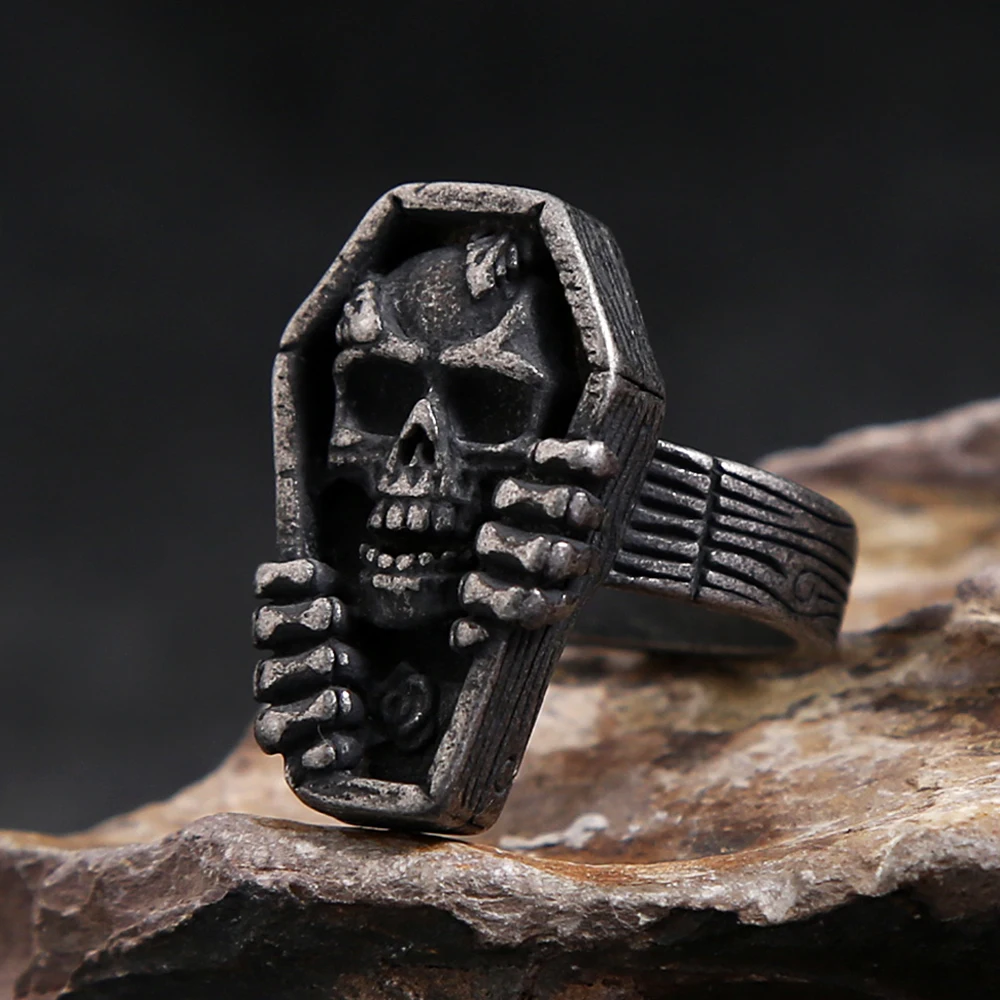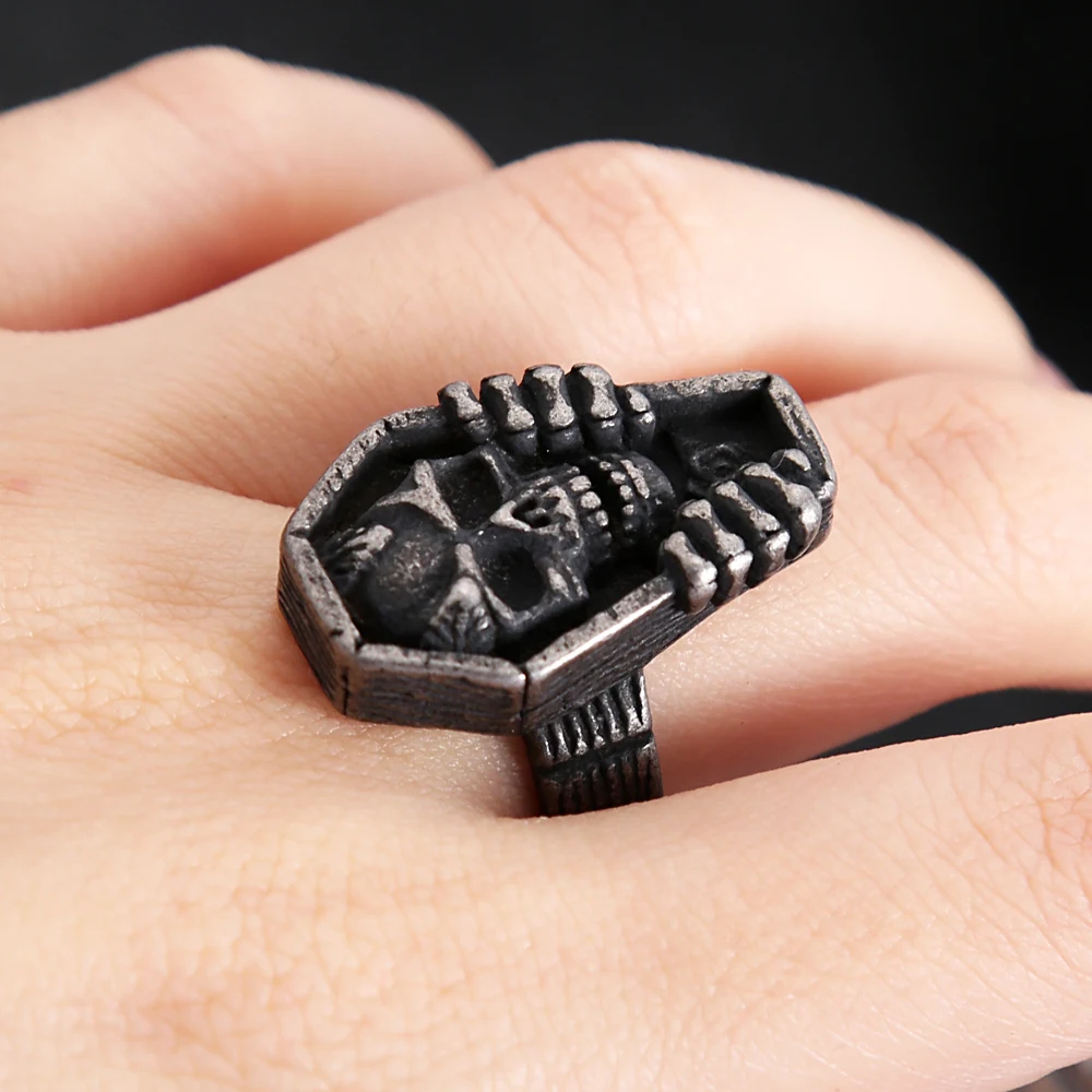 Joyería vikinga: anillo punk vintage de acero inoxidable con calavera de vampiro negra para hombres y niños, anillos de ataúd únicos, joyería de moda genial, regalo.