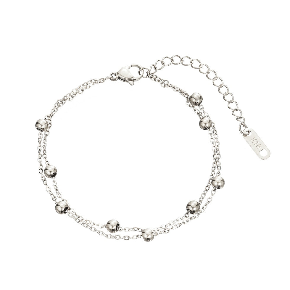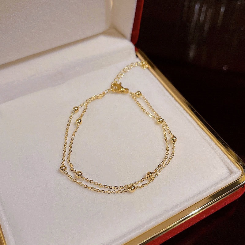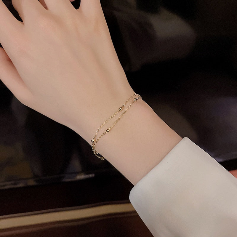 Pulsera de oro 585 con cuentas redondas de doble capa y dijes de moda, cadena de acero inoxidable y titanio, para mujer.