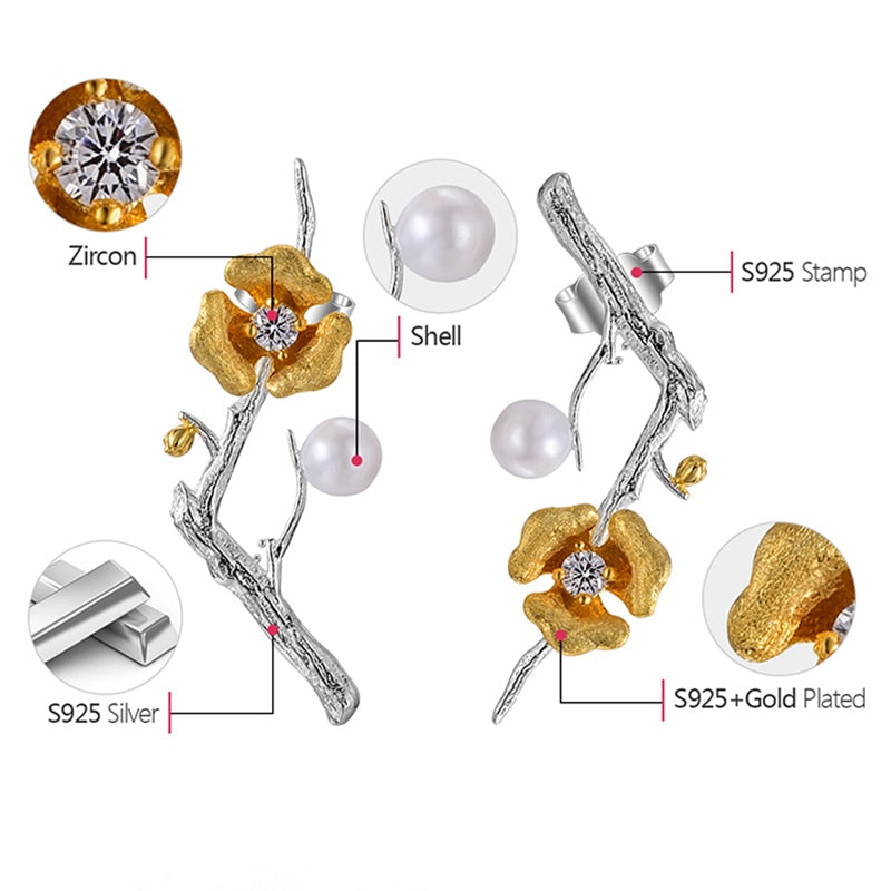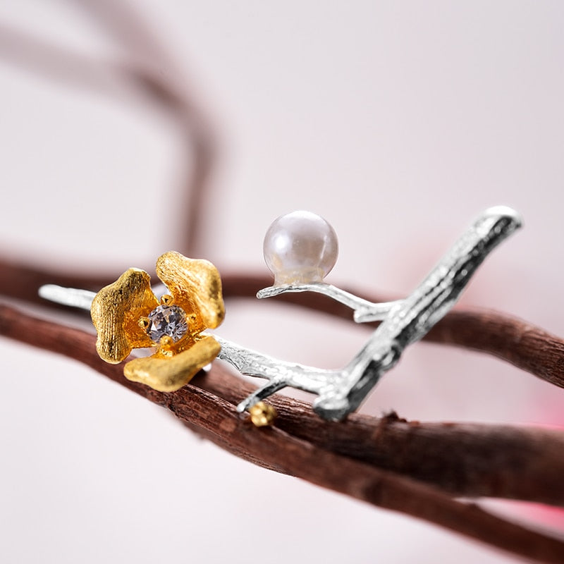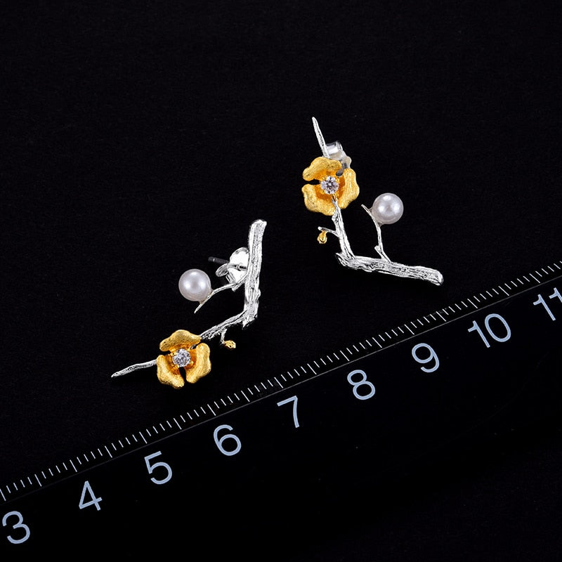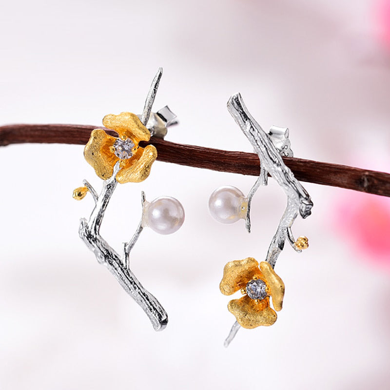 Pendientes de plata de ley 925 auténtica con delicadas flores de ciruelo para mujer.