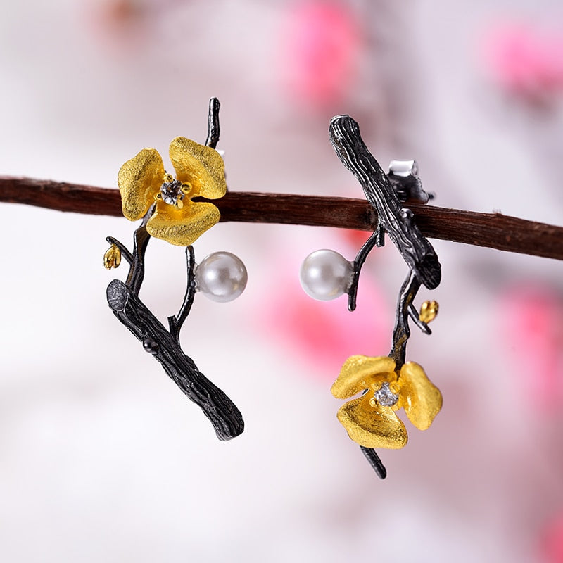 Pendientes de moda: pendientes de plata de ley 925 auténtica, joyería fina de diseñador hecha a mano, delicados pendientes colgantes con flor de ciruelo para mujer.