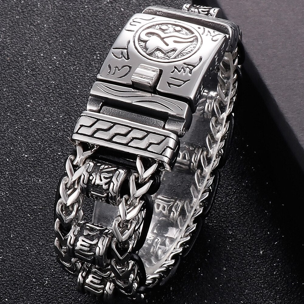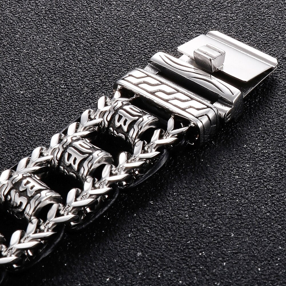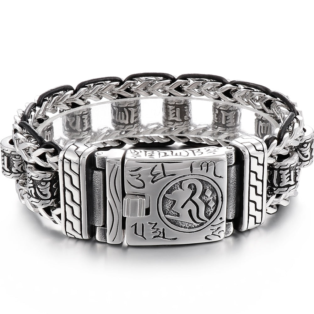 Pulsera religiosa para hombre, acero inoxidable 316L, 22 mm, con eslabones de escrituras budistas, pulsera de cuero, joyería para mano.