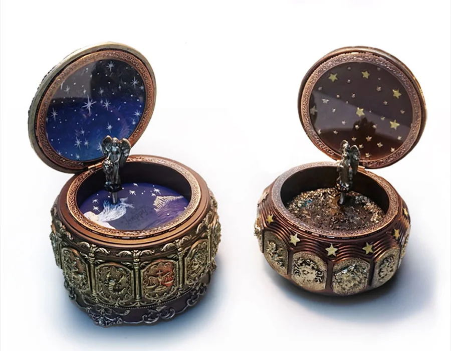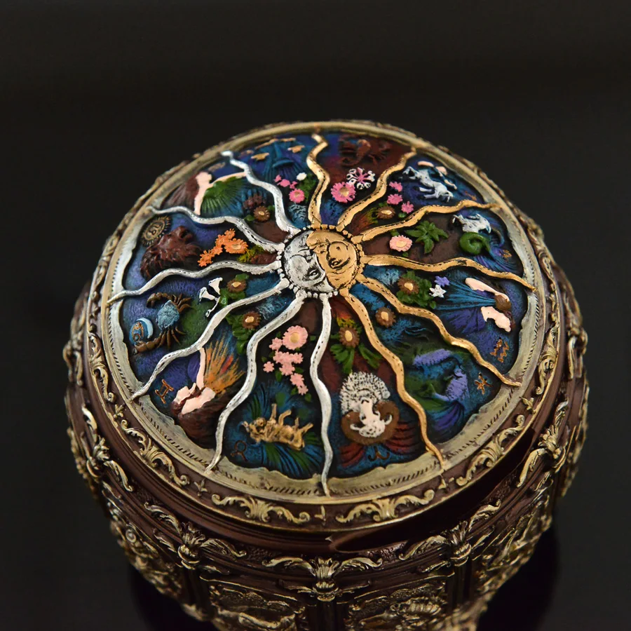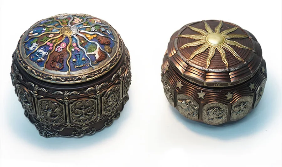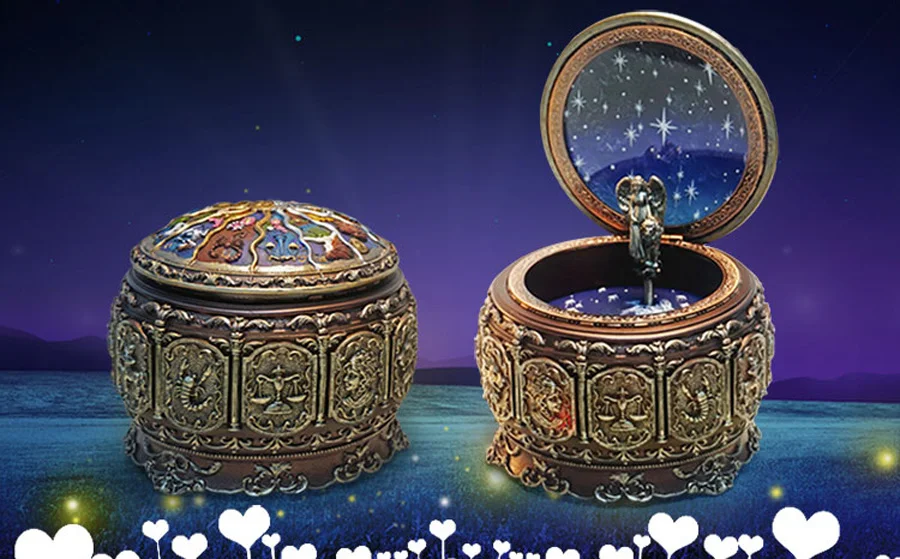 ¡Esta caja de música del zodíaco es cautivadora! Está hecha de resina sintética con movimiento metálico y decorada con todos los signos del zodíaco.