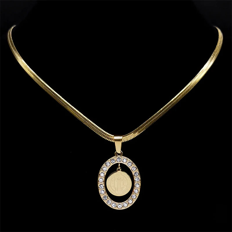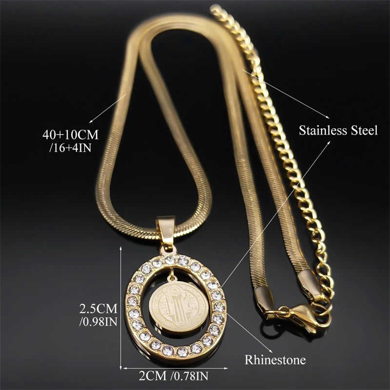 Collar de cadena de serpiente de San Benito católico para mujeres y hombres, de acero inoxidable con diamantes de imitación, color dorado, con medalla, joyería