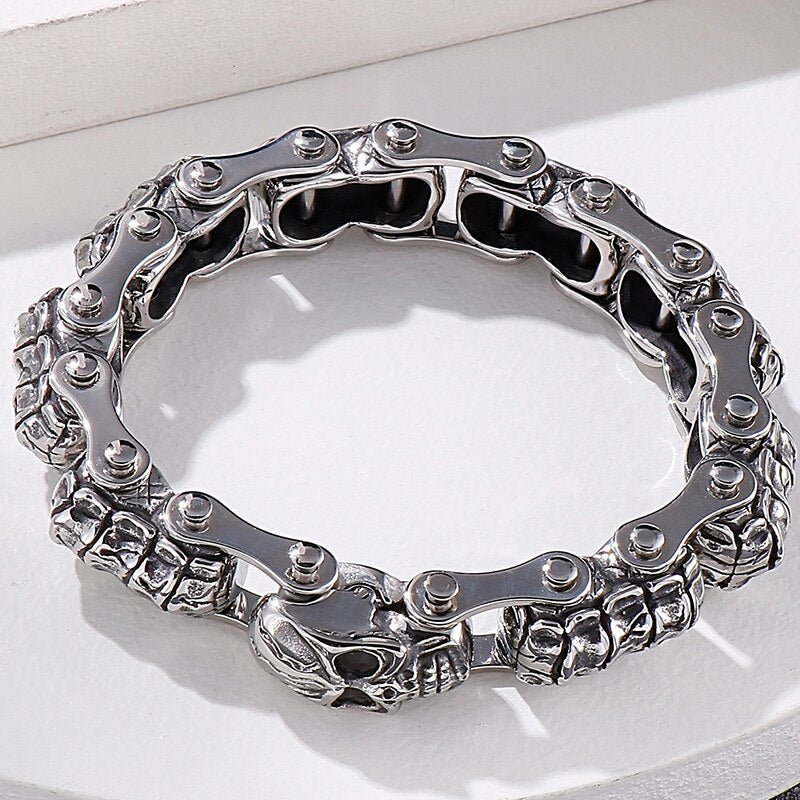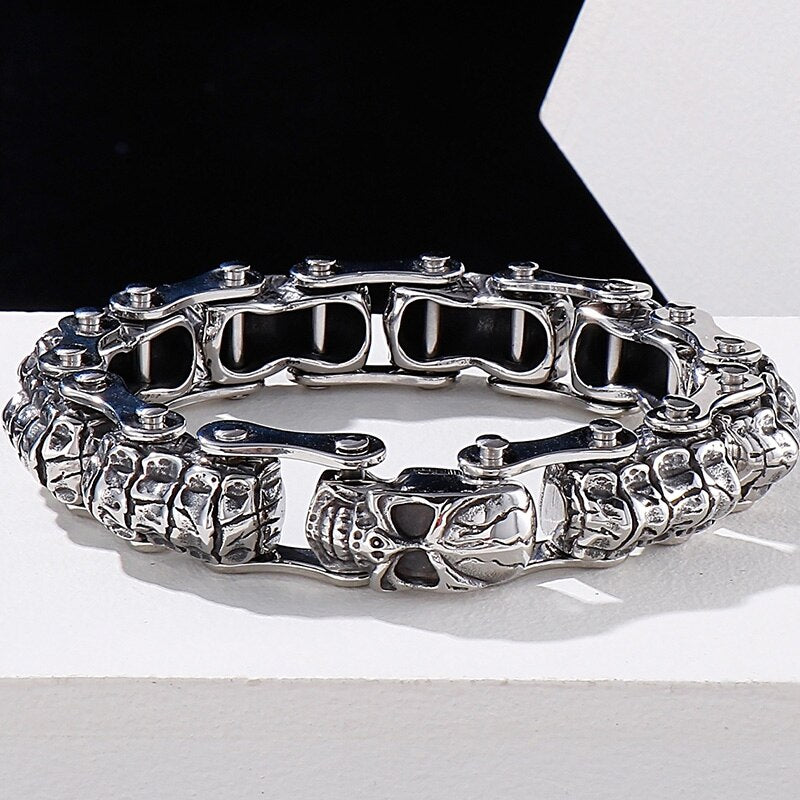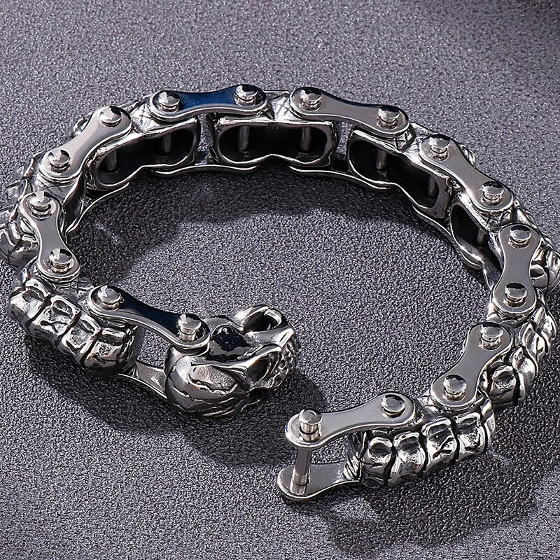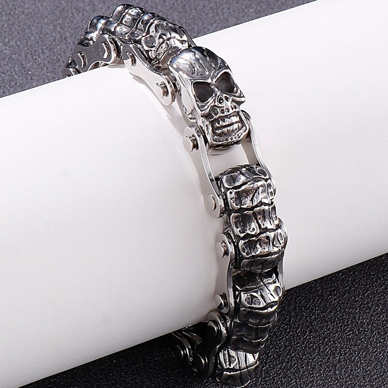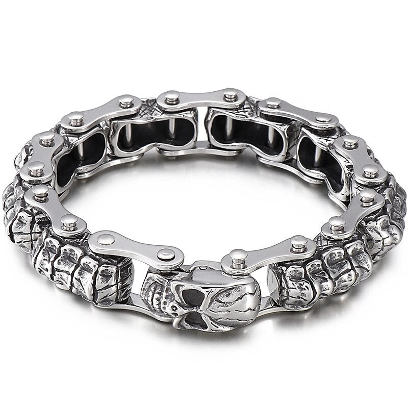Pulsera de acero inoxidable con calavera de rock and roll para hombre, cadena de eslabones de 14 mm, joyería gótica de motociclista.