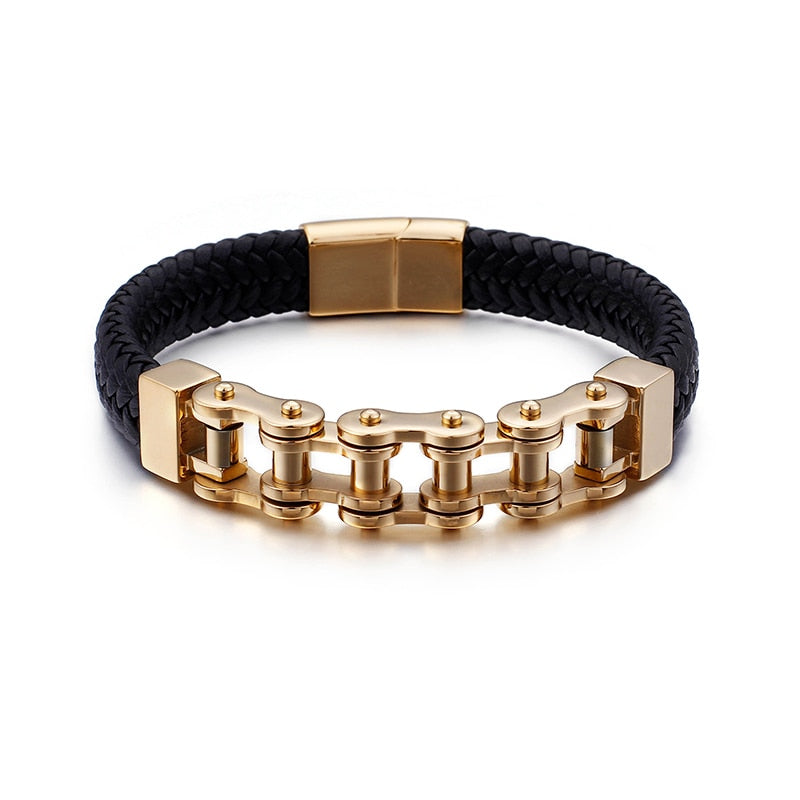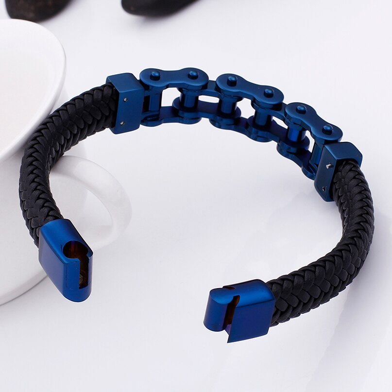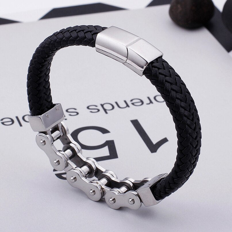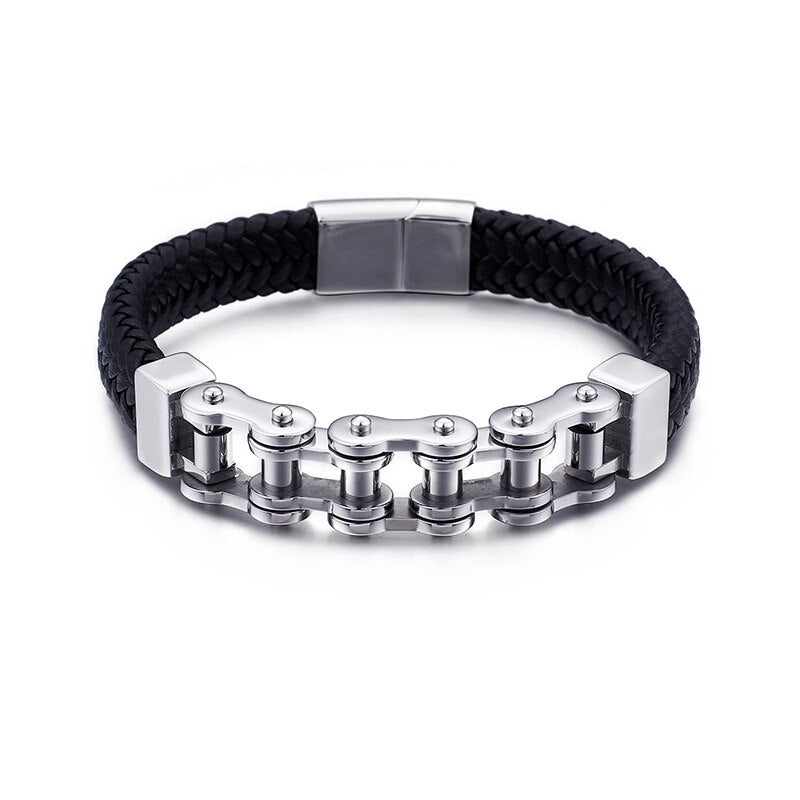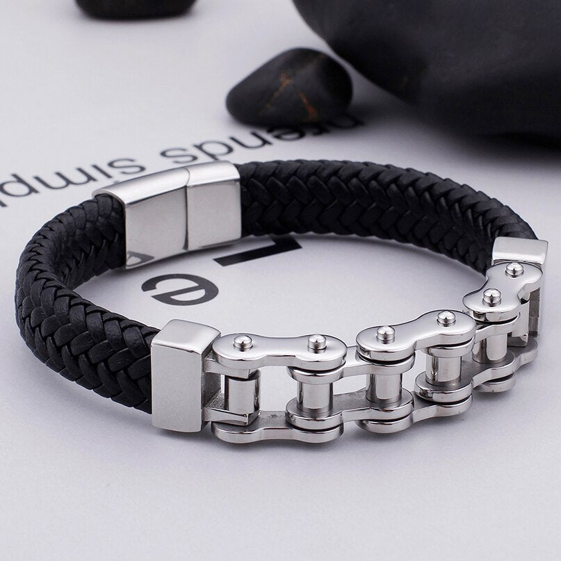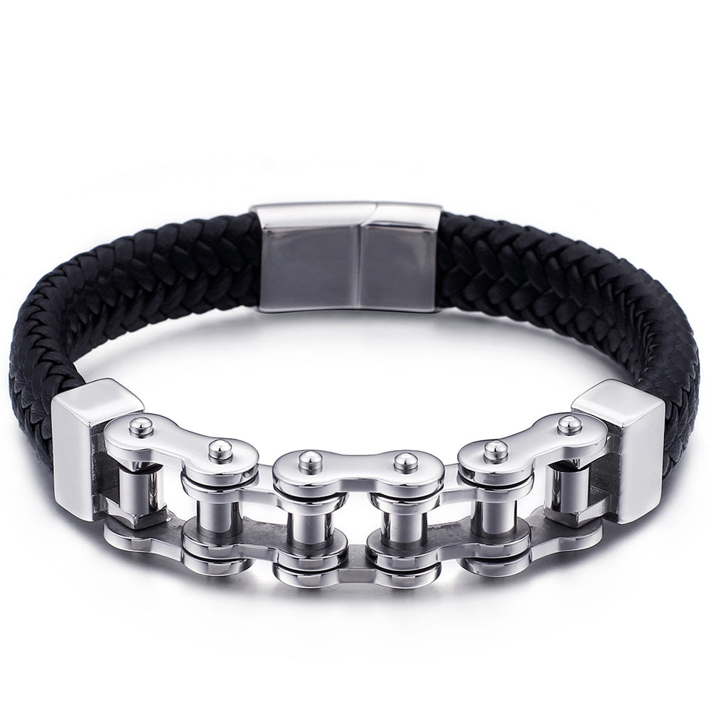 Pulsera de cadena de eslabones de bicicleta Rocker Bike para hombre, de acero inoxidable y cuero, con cierre magnético.