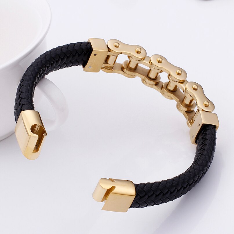 Pulsera de cadena de eslabones de bicicleta Rocker Bike para hombre, de acero inoxidable y cuero.