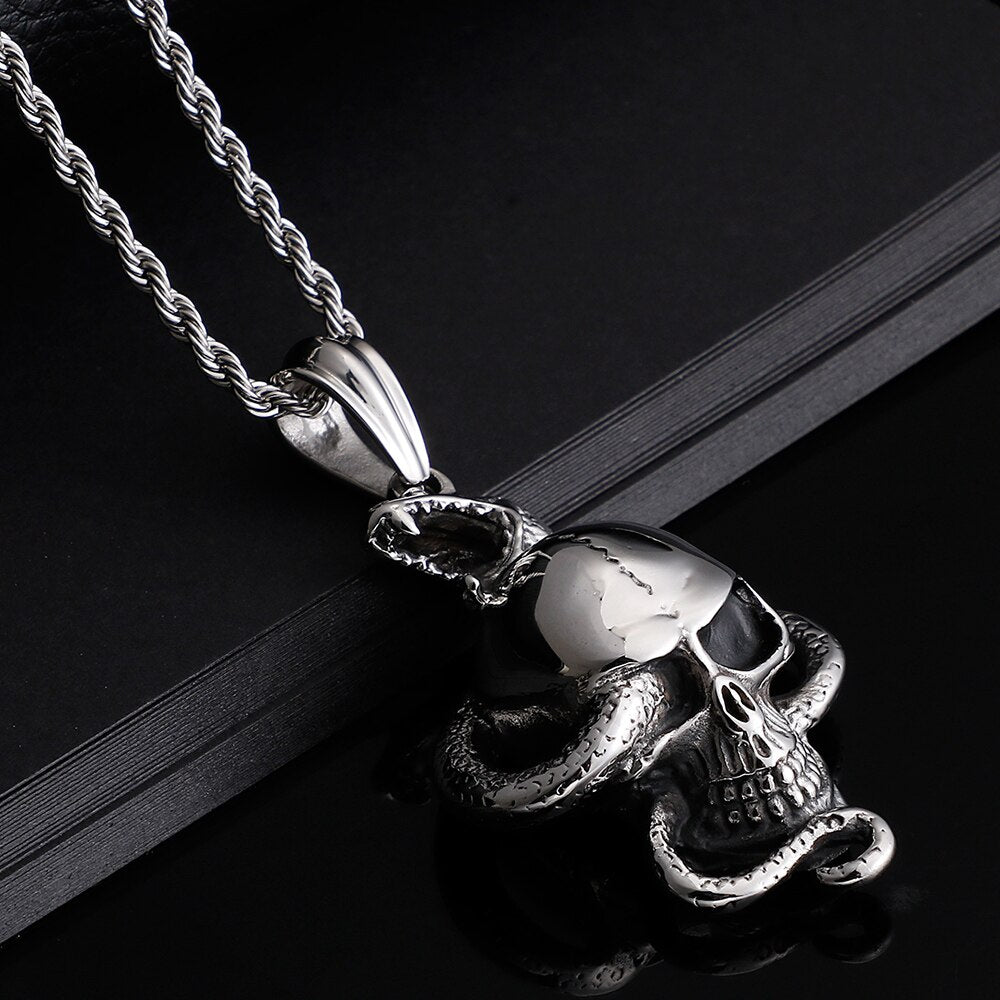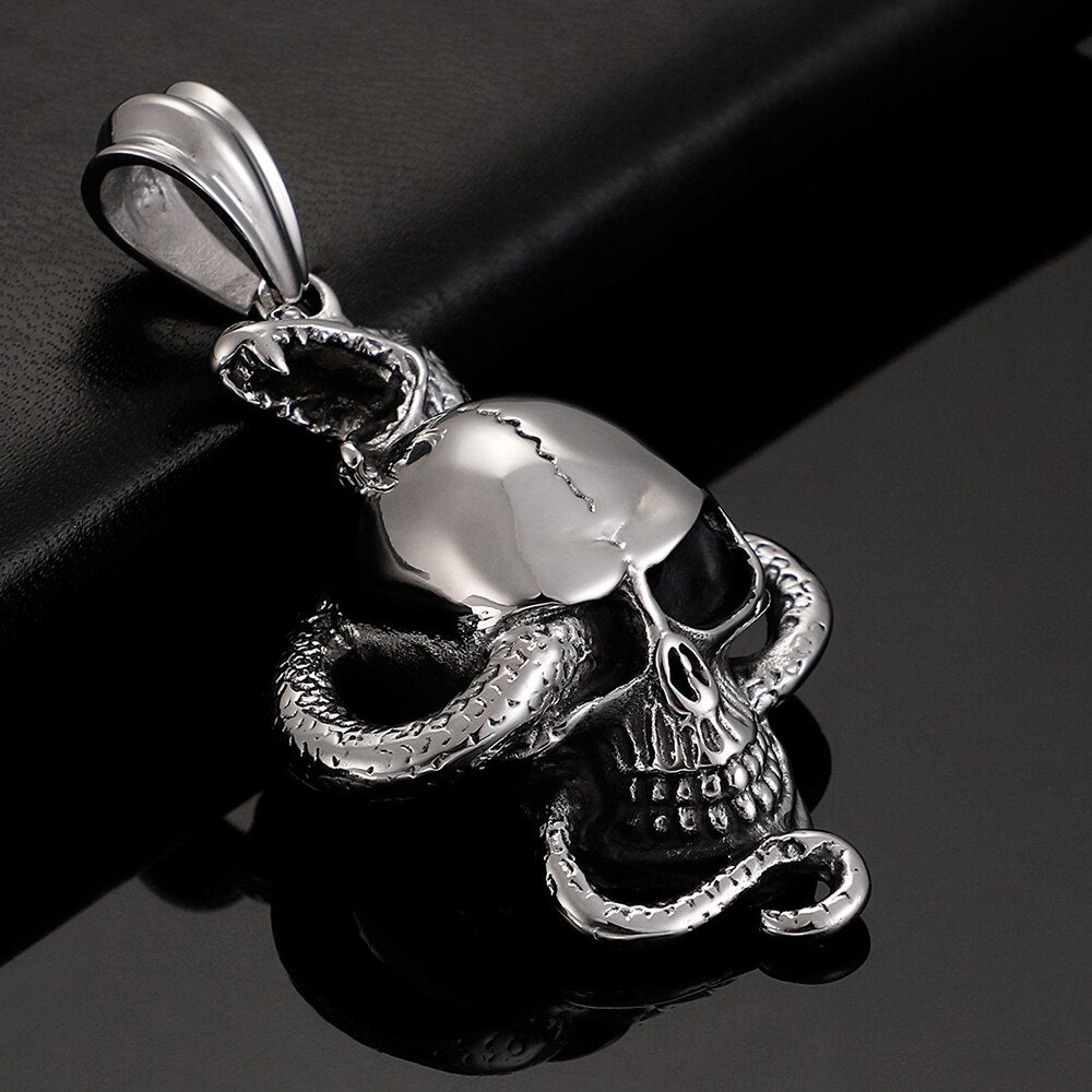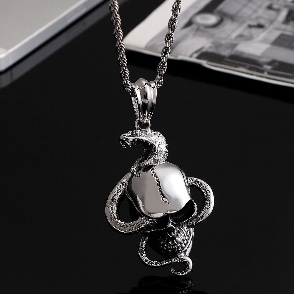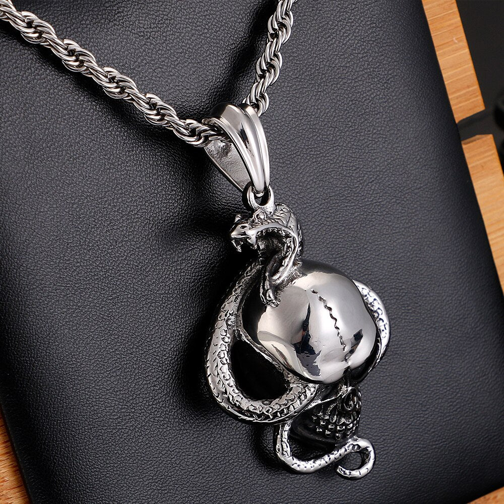 Collar con colgante de calavera y serpiente de acero inoxidable macizo Rocker para hombres y mujeres