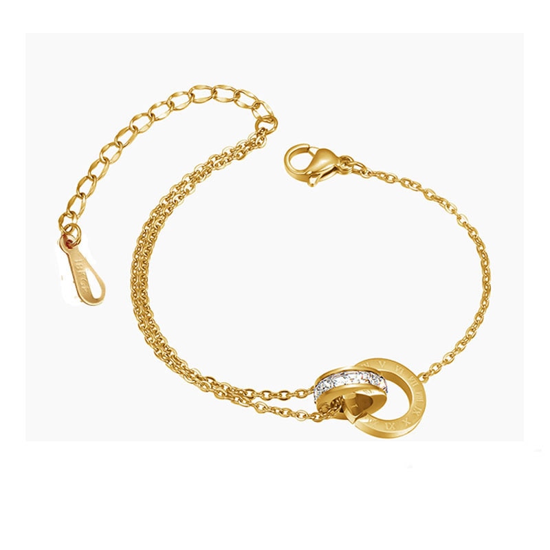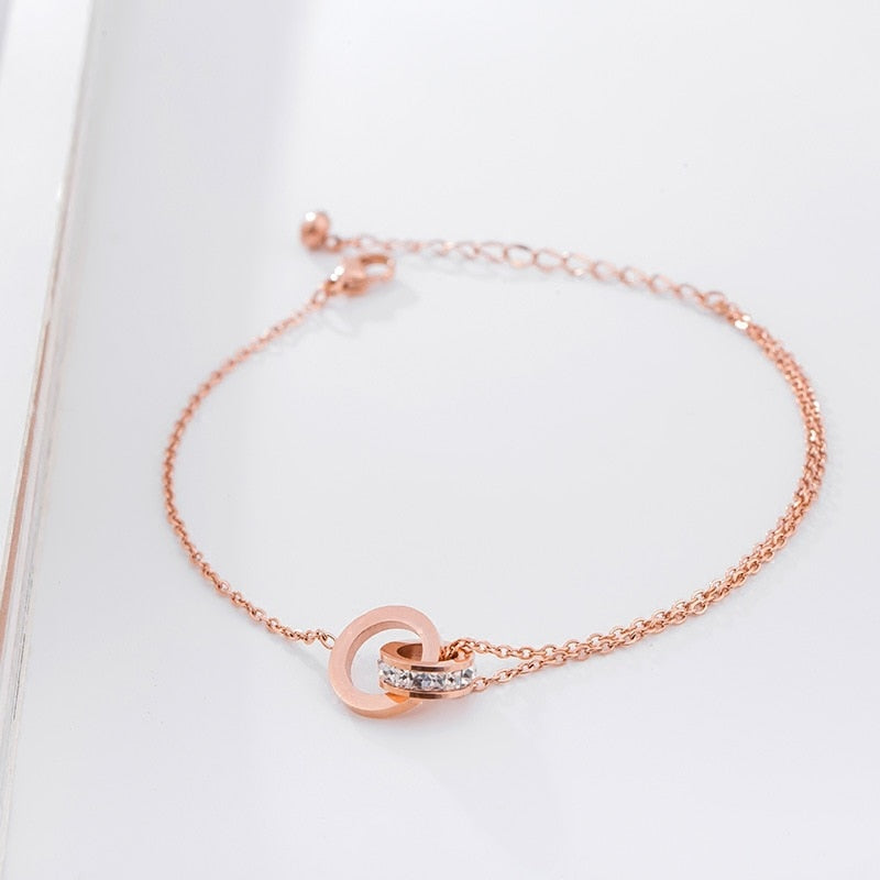 Pulsera tobillera de acero inoxidable en oro rosa 585 para mujer, con forma de corazón y círculo de cristal, ideal como regalo.