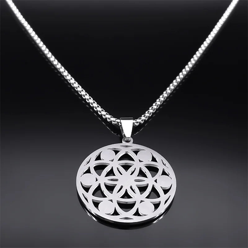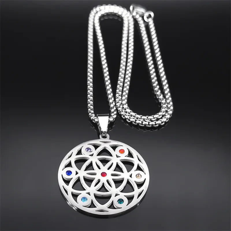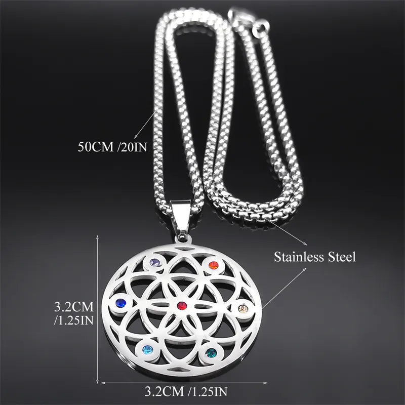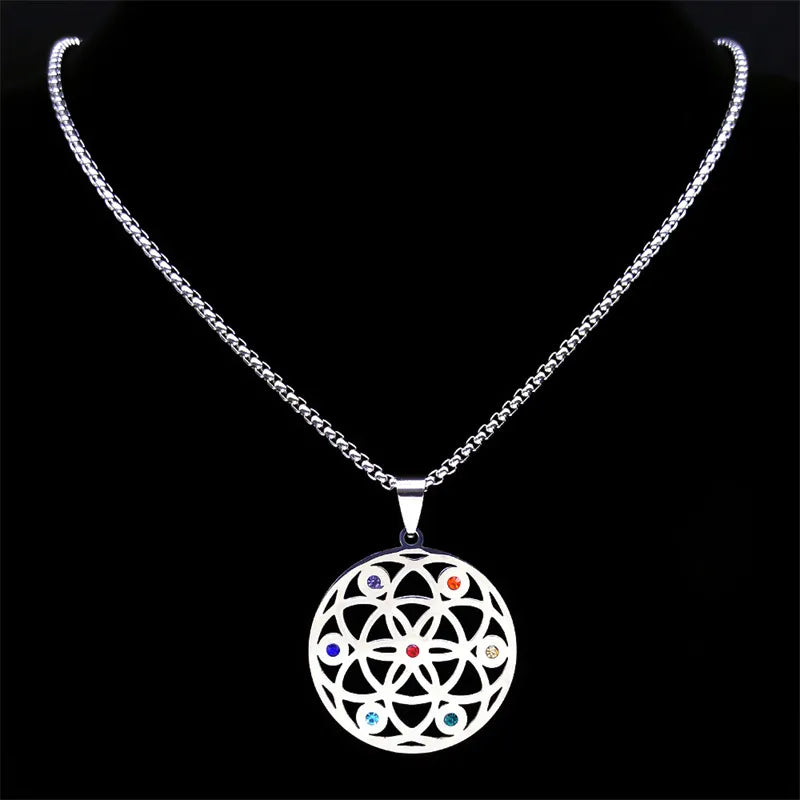 Collar de 7 chakras con la semilla de la vida de geometría sagrada para mujeres y hombres, de acero inoxidable, color plata, con cadena de flores estéticas.