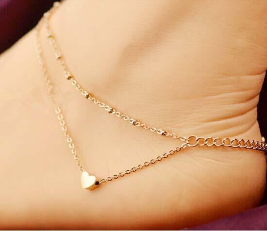 Tobilleras: Nueva joyería de playa, tobillera sexy con corazón en tono dorado, cadena de doble capa, tobillera para mujer, joyería para pies.