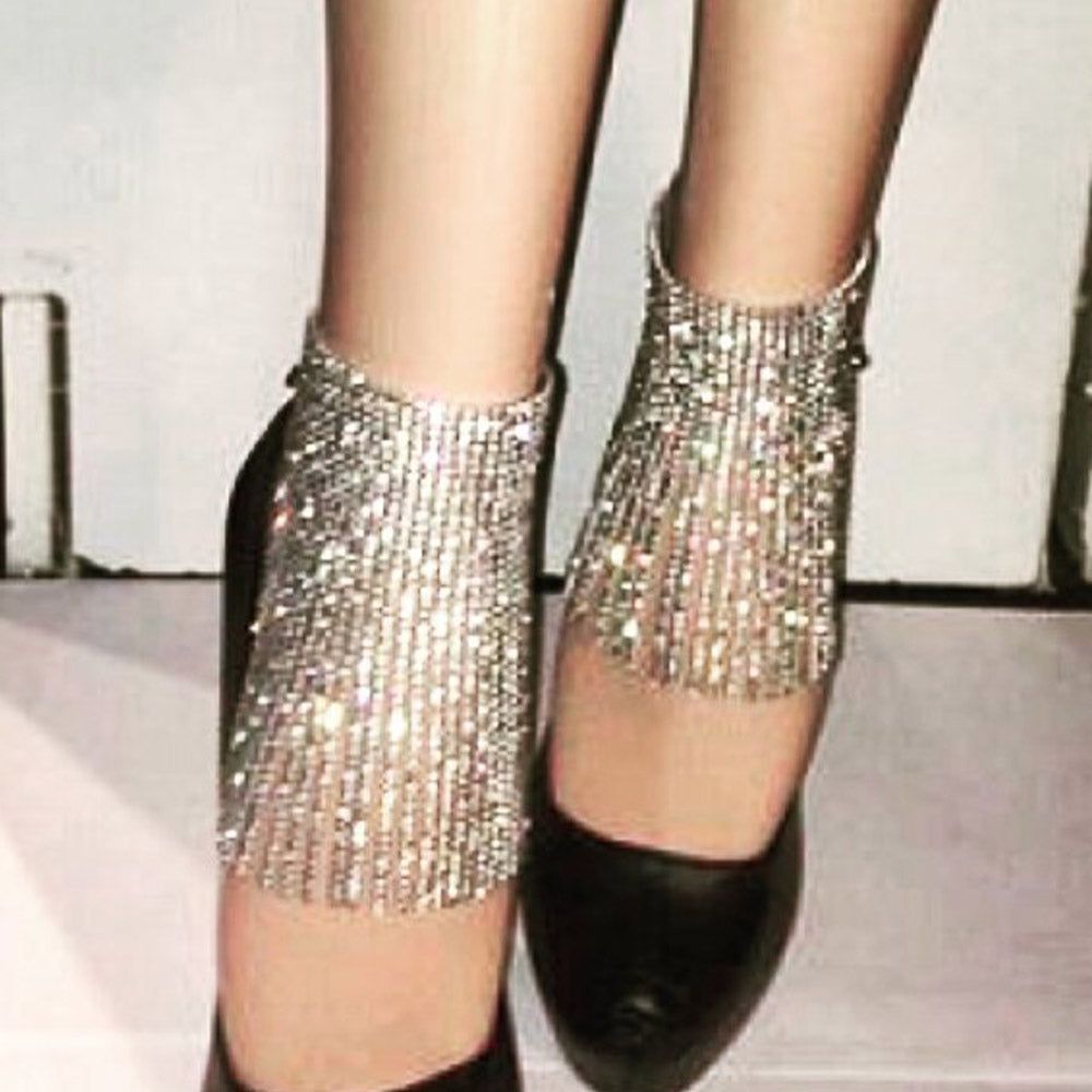 Tobilleras - Tobillera con borlas largas y brillantes de varias filas de diamantes de imitación, pulsera con dijes, joyería lujosa para pies, sandalia descalza