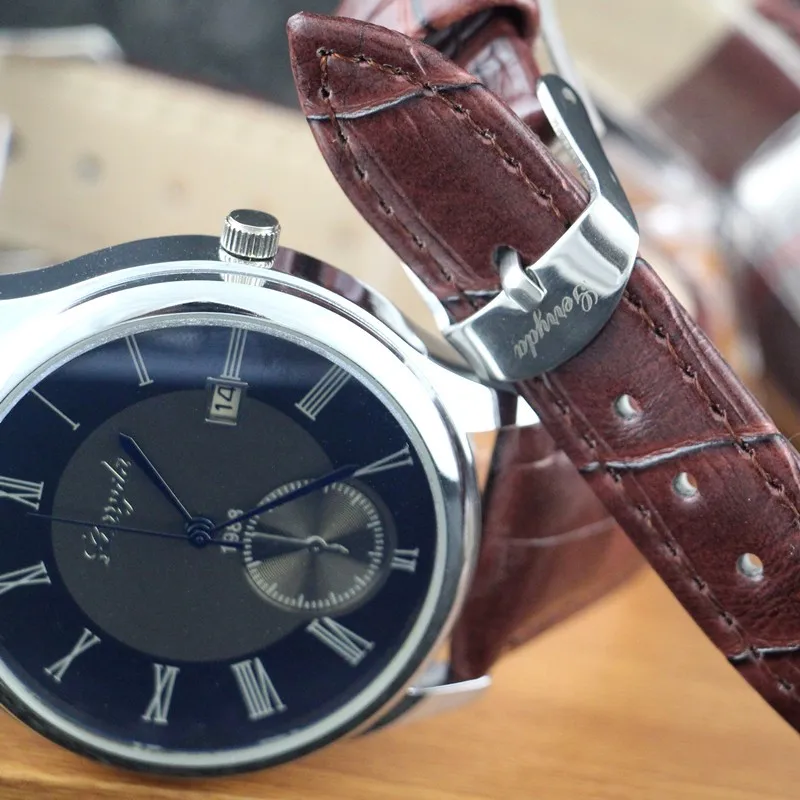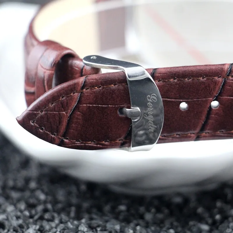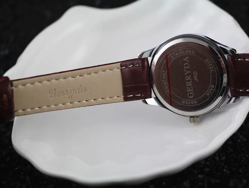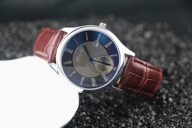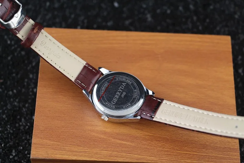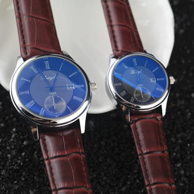 Relojes para amantes: ¡Impermeables! Correa de cuero, caja plateada, fecha automática. Reloj de cuarzo Gerryda para parejas.