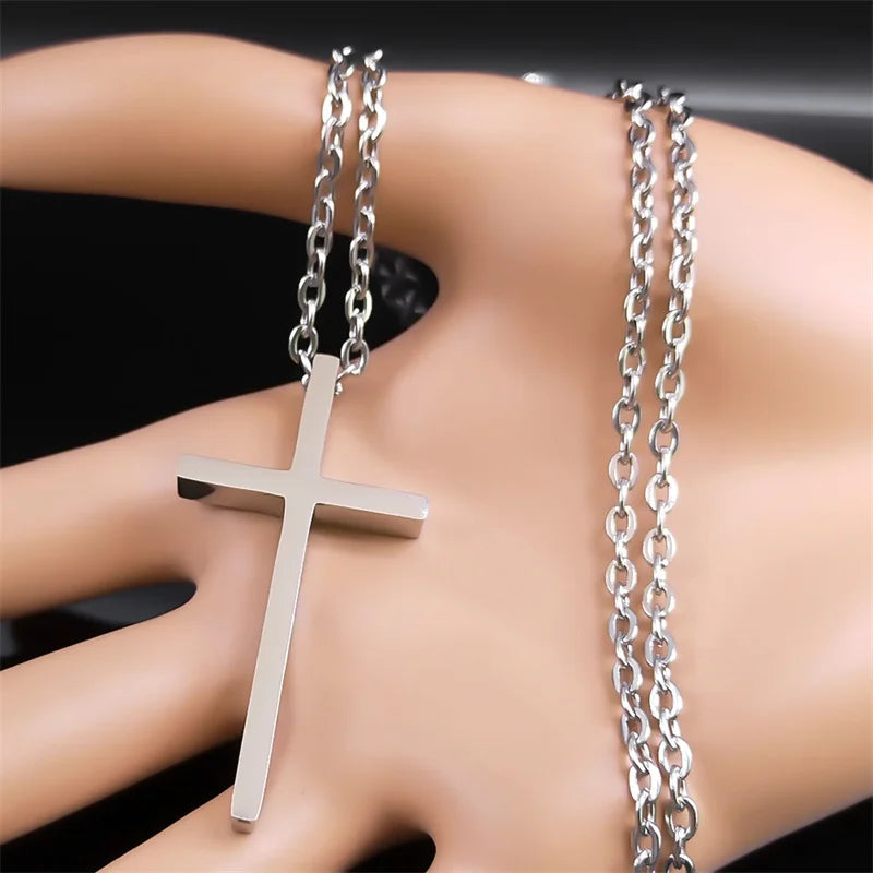 Collar con colgante de cruz simple para mujer y hombre, de acero inoxidable, color plata, con cadena de Jesucristo, joyería