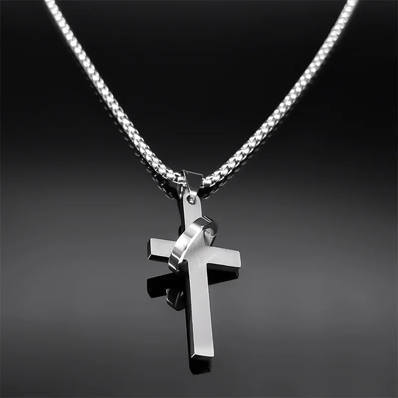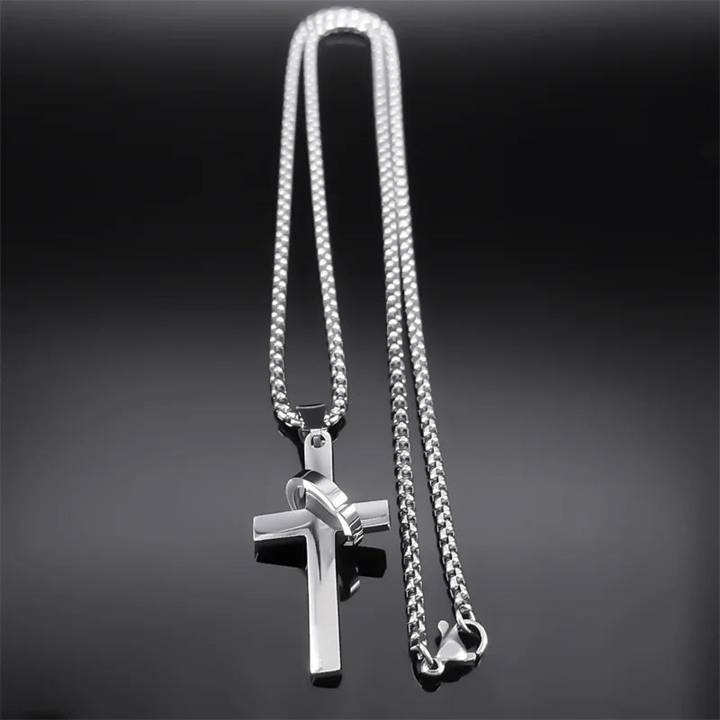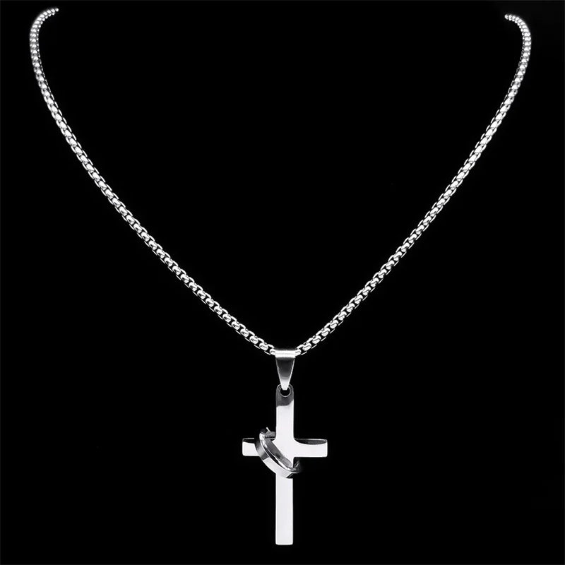 Collar con colgante de cruz simple con círculo para mujer y hombre, de acero inoxidable, estilo punk, estilo cruz cristiana.