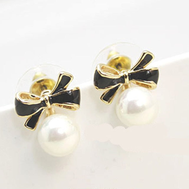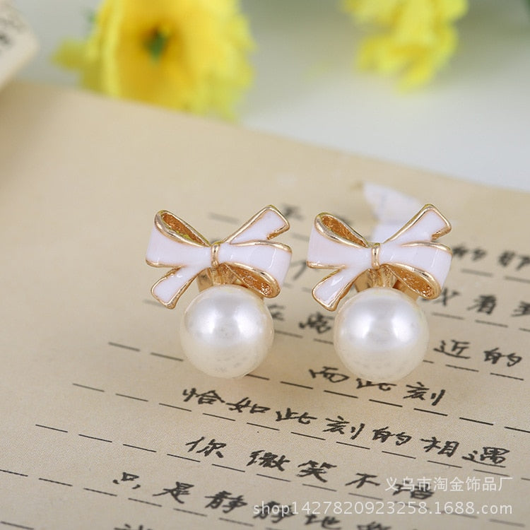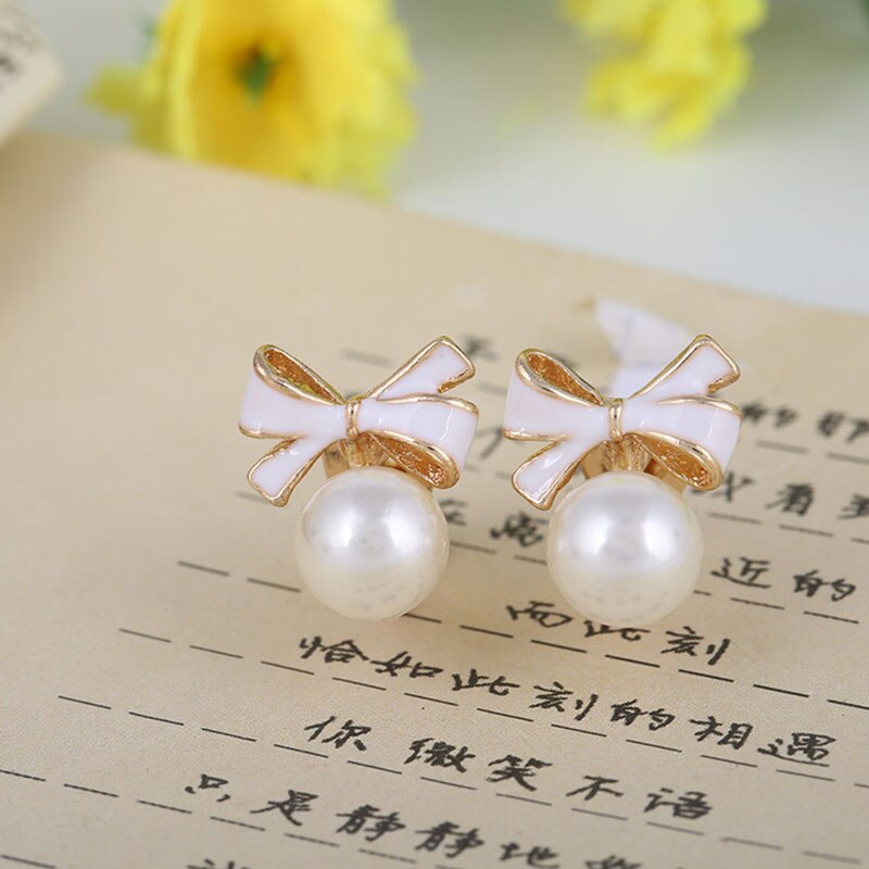Pendientes sin perforar con lazo, color rosa y blanco, con perla simulada