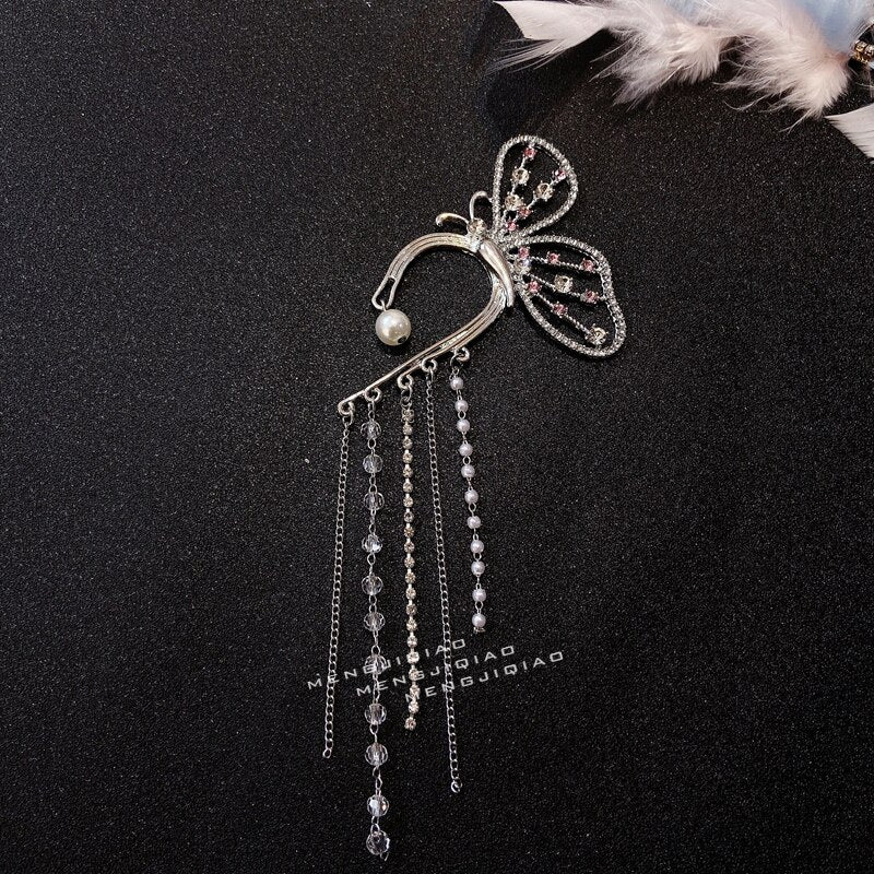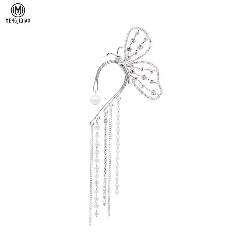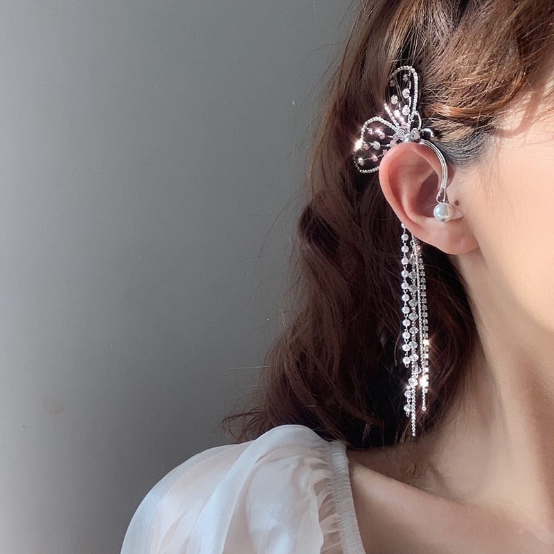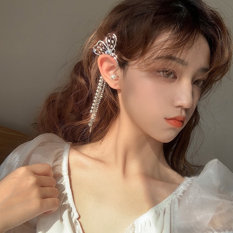 Clip para colgar en la oreja con borla de diamantes de imitación y mariposa elegante de Corea